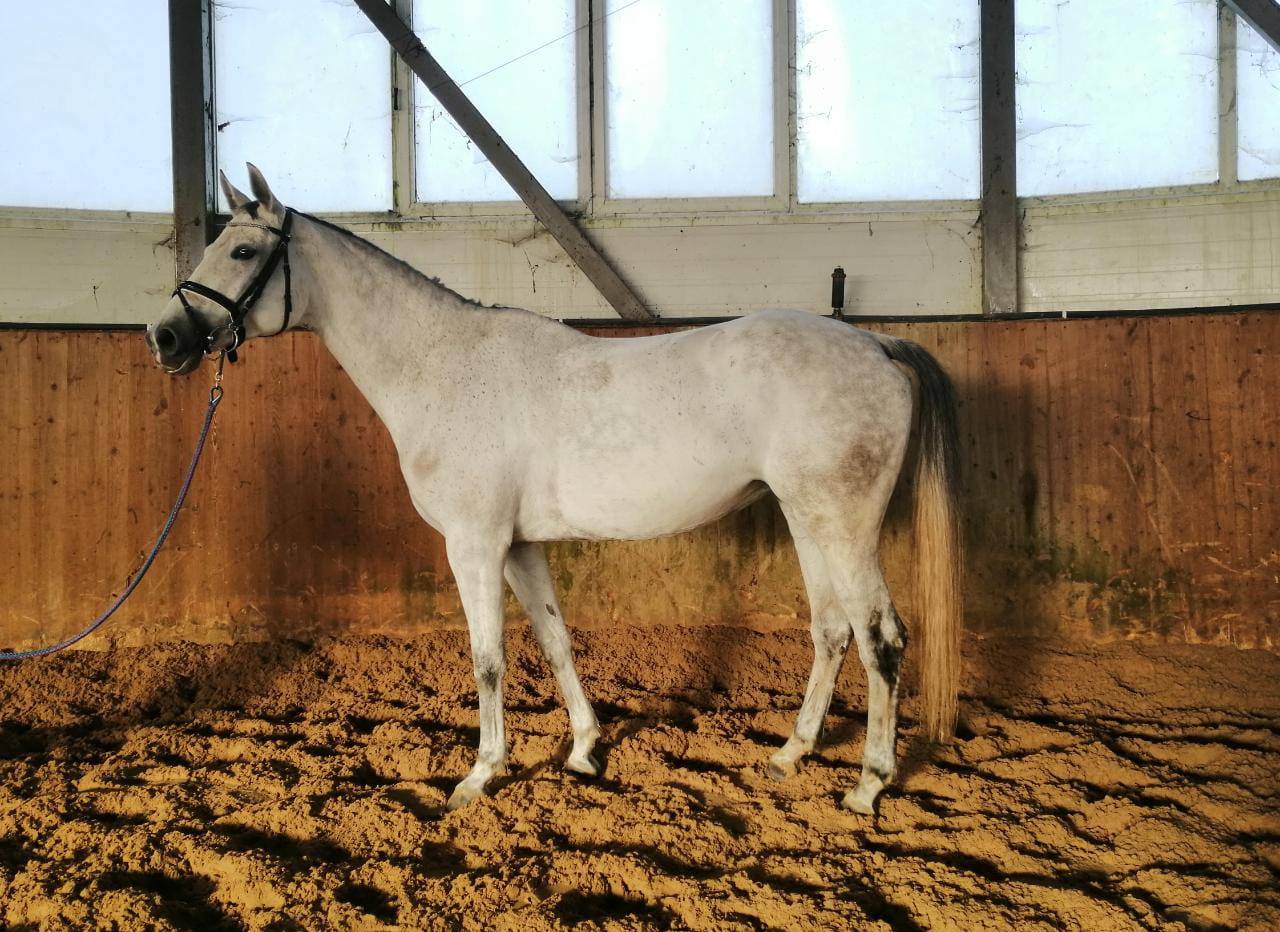 Кобыла тракененской породы, серой масти.