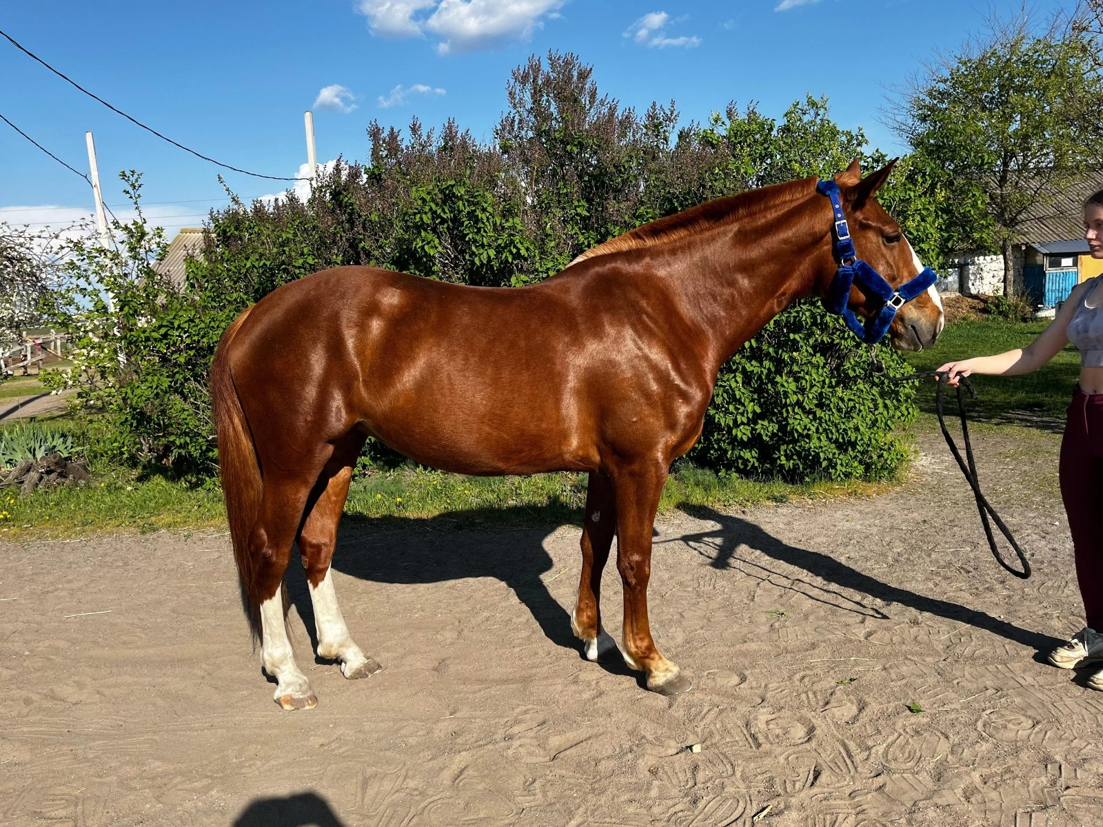 Напрыгана по маршрутам до 90 см, может выше. Аккуратная, жерди не трогает, сильный зад, отличная техника прыжка. Очень выносливая, любит прогулки.
