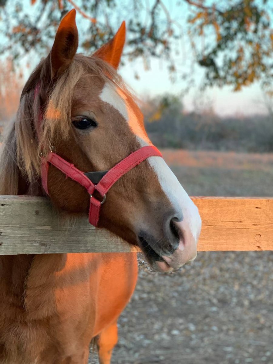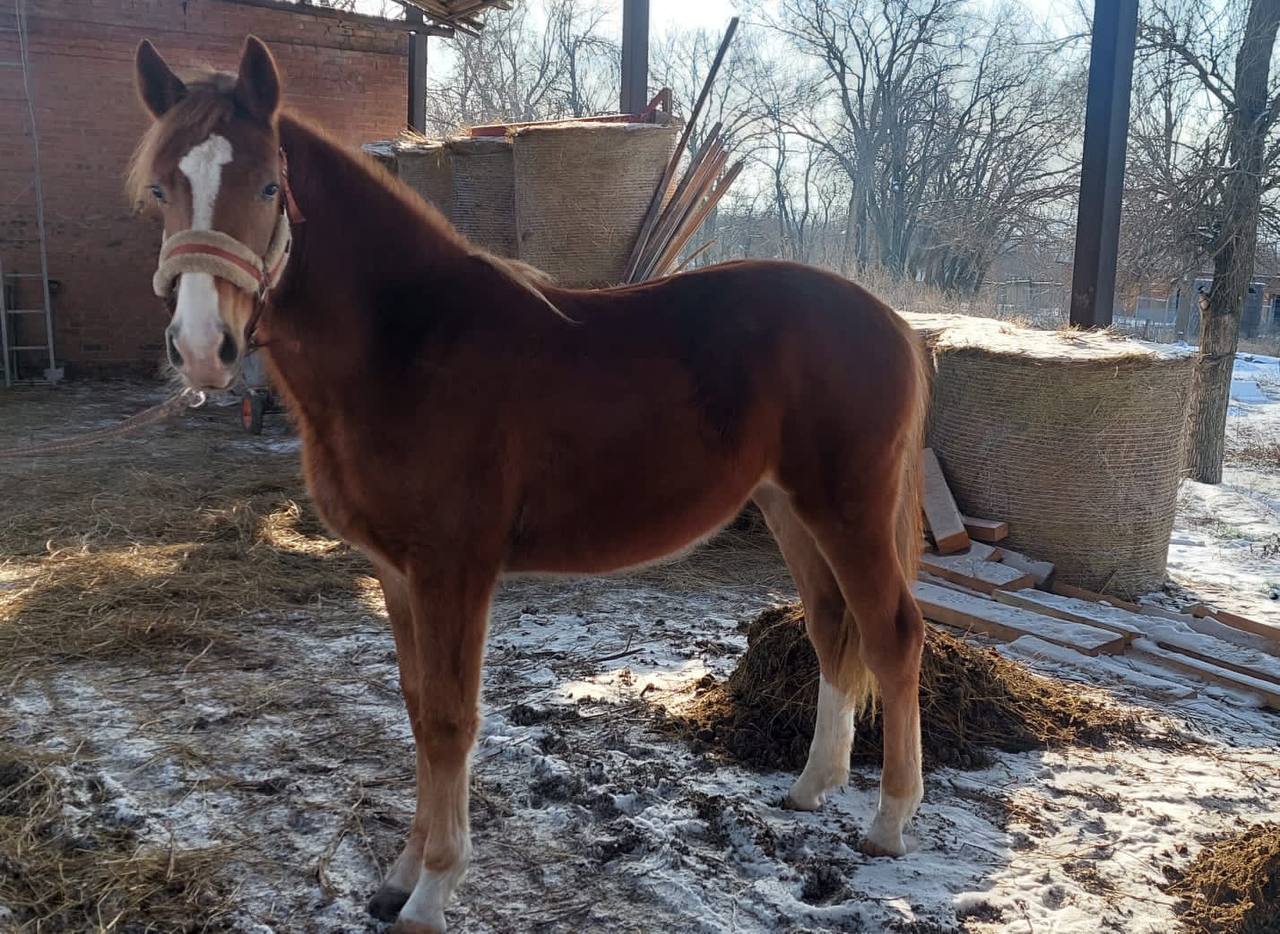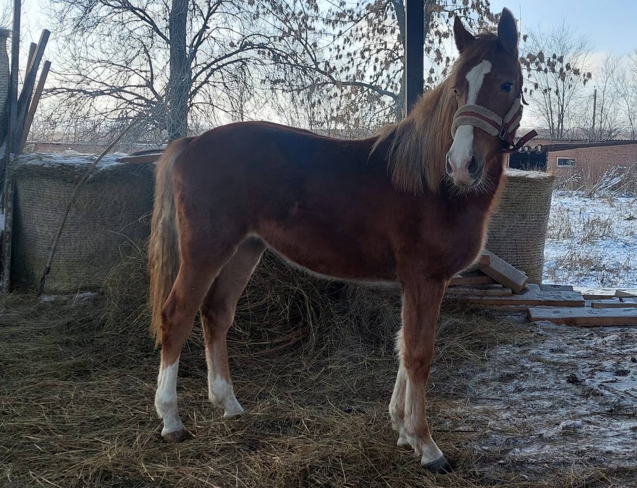 Нарядная кобыла полукровной породы (помесь будённовской породы + 0,25 советского тяжеловоза), рыжей масти с яркими отметинами.