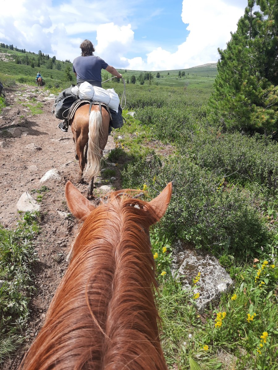 Выехали со стоянки было принято решение сначала съездить на озеро, а оттуда ехать на стоянку для днёвки. Дорога на озеро.. мягко говоря неприятная. А если совсем честно, то из нас с вами, никто бы на своих лошадях туда не поехал. Для начала это крутой спуск с горы, по узкой тропинке и будет плохо, если лошадь споткнётся и вы с ней проедете вниз.