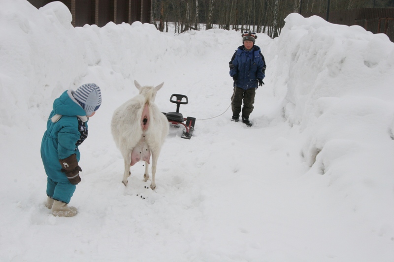 Тань, на породу особо не на какую не похожа. :) Скорее всего зааненская помесь. И как они у тебя через такой заборчик в стайке не перепрыгивают! Вот что интересно. Дня 3 назад - звонок: Вы не покупали и не продавали серенькую комолую козочку? Нет, говорю. - Мне сказали, что объявление было на Авито. - Нет, говорю, серую, но рогатую продавала по осени, но в результате обменяла. Женщина настаивала, только я так и не поняла, что мне шьют: продажу или покупку. Поняла только, что эту козочку звали Майка. Только сейчас подумала, может это твоя Мышка?