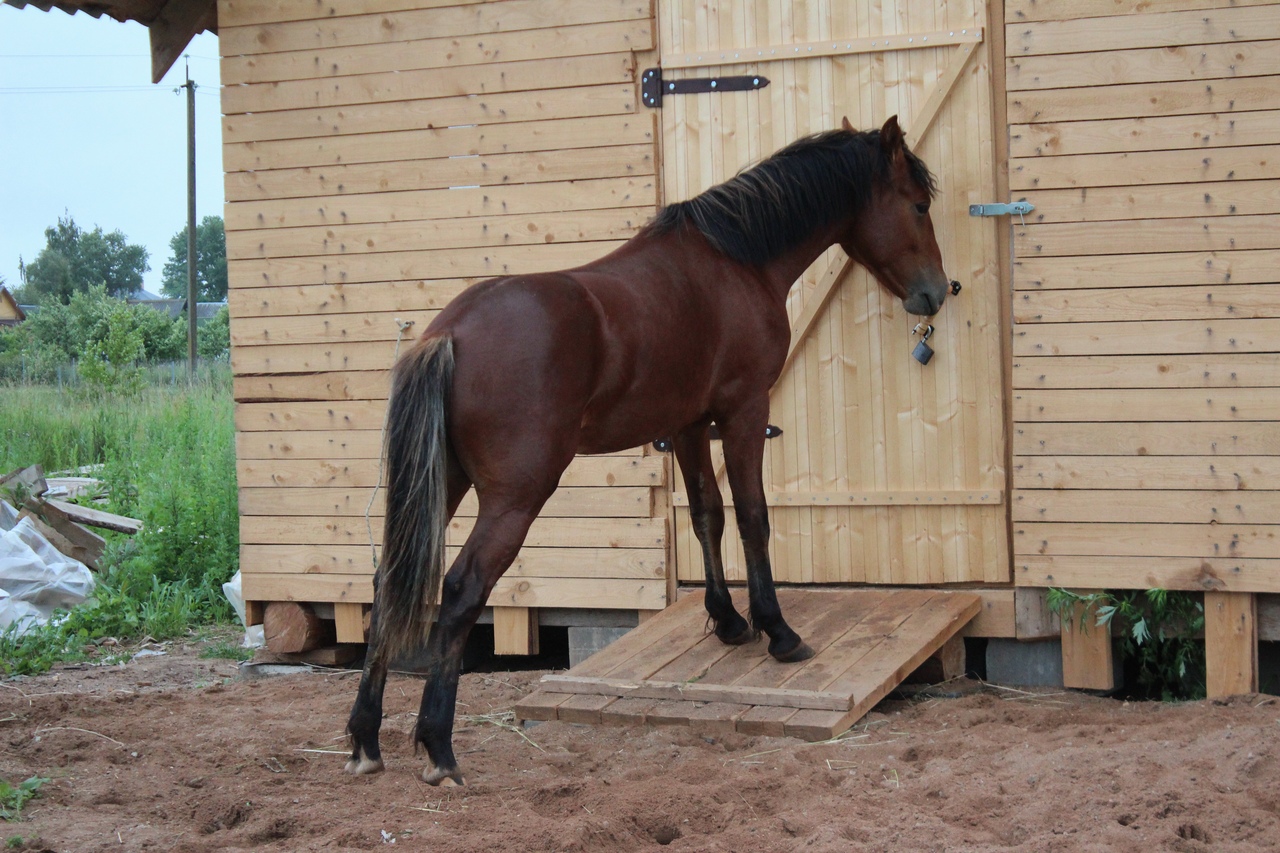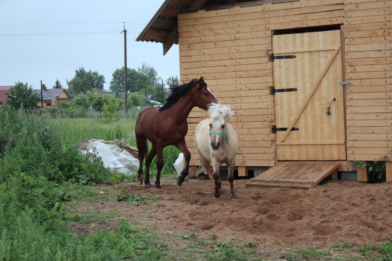 Месяц лошадки гуляли рядом с конюшней, порядком вытоптали уже поляну. Можно колья перебить, трава там еще есть. Но я решила выгонять их уже подальше, чтобы не привязывать Гобоя. Застоялся, пусть бегает. А вблизи конюшни не хочется отпускать без привязи, мало ли, на неогороженный участок соседа залезет.