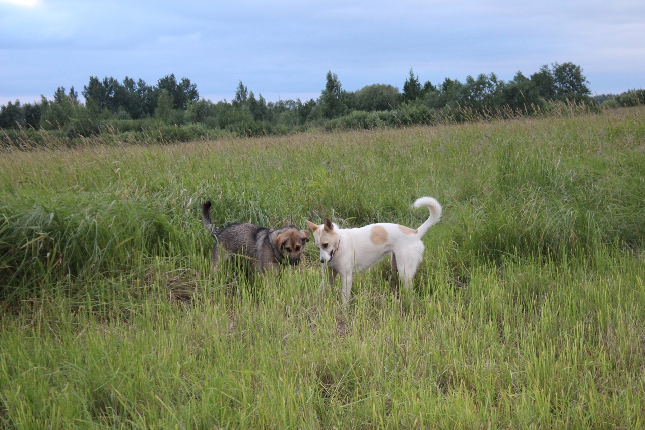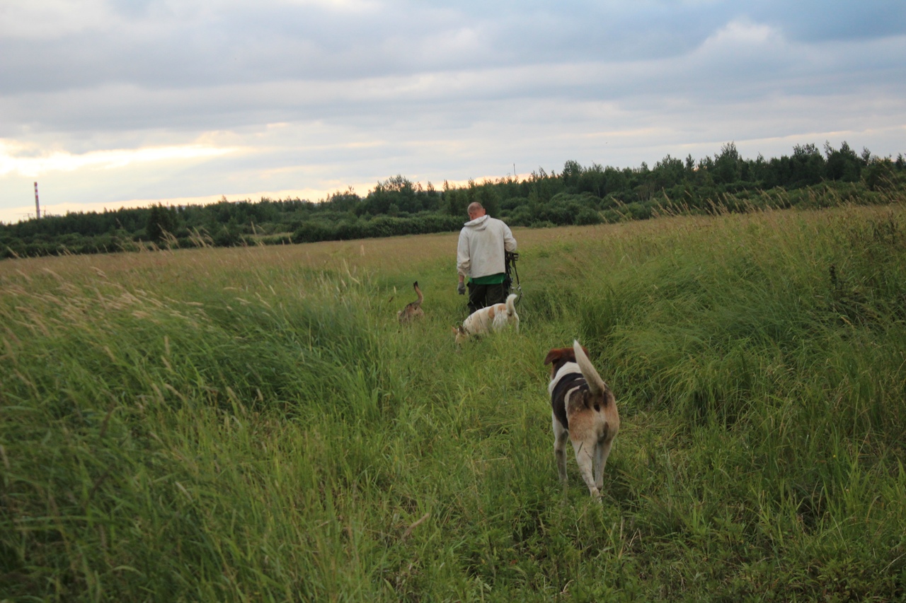 Идём забирать лошадок с выпаса. Такая свора за Лёней чешет ))) К нашим двум еще Абба присоединился.