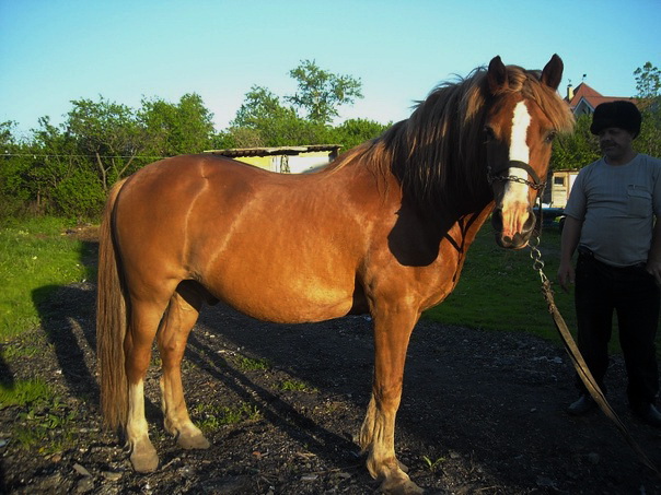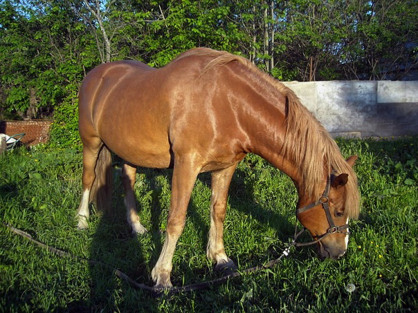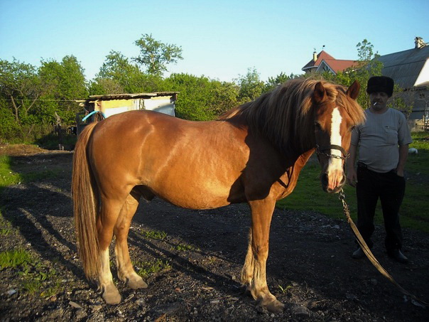 Придурок управляющий, больной на голову, догадался поставить ее на привязь рядом с привязанным же быком. Результат - бык рогом пропорол лошади брюхо, выпустив ей кишки наружу. Ветеринар долго боролась за ее жизнь. Лошадь удалось спасти, а на пузе осталась большущая шишка.