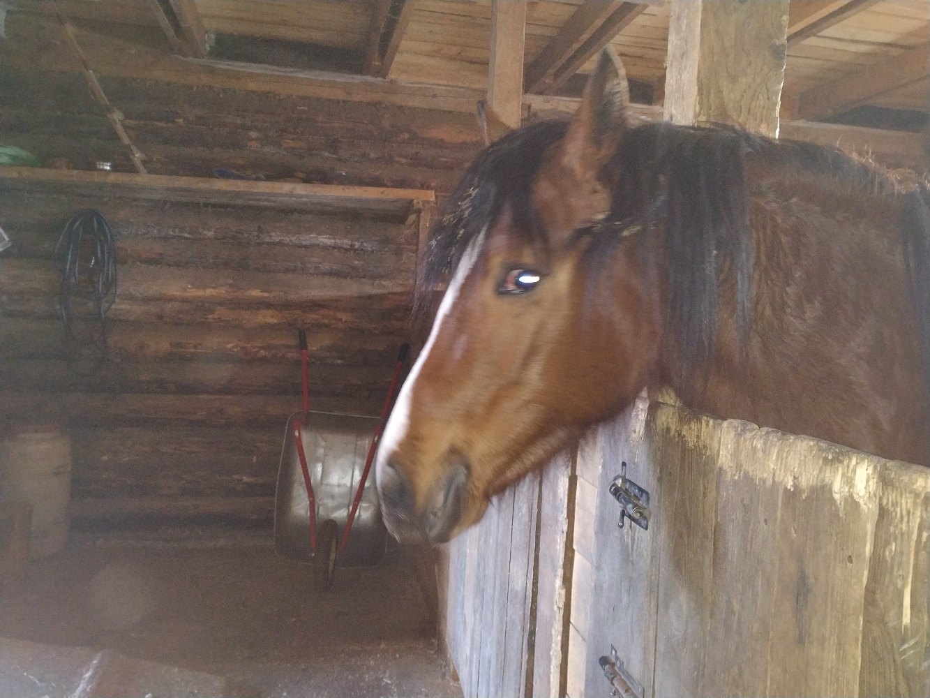В общем, шло время, собачка подросла и морозной зимой принесла приплод. Конечно, щенки все помёрзли в дырявой будке (((( Я узнала про это только спустя месяц-два, и сразу отвезла Брошку на стерилизацию. На тот момент собака ещё не сидела безвылазно на цепи. Ее отпускали, она прибегала на конюшню, где и кормилась у меня. Я ее вообще считала наполовину своей собакой.