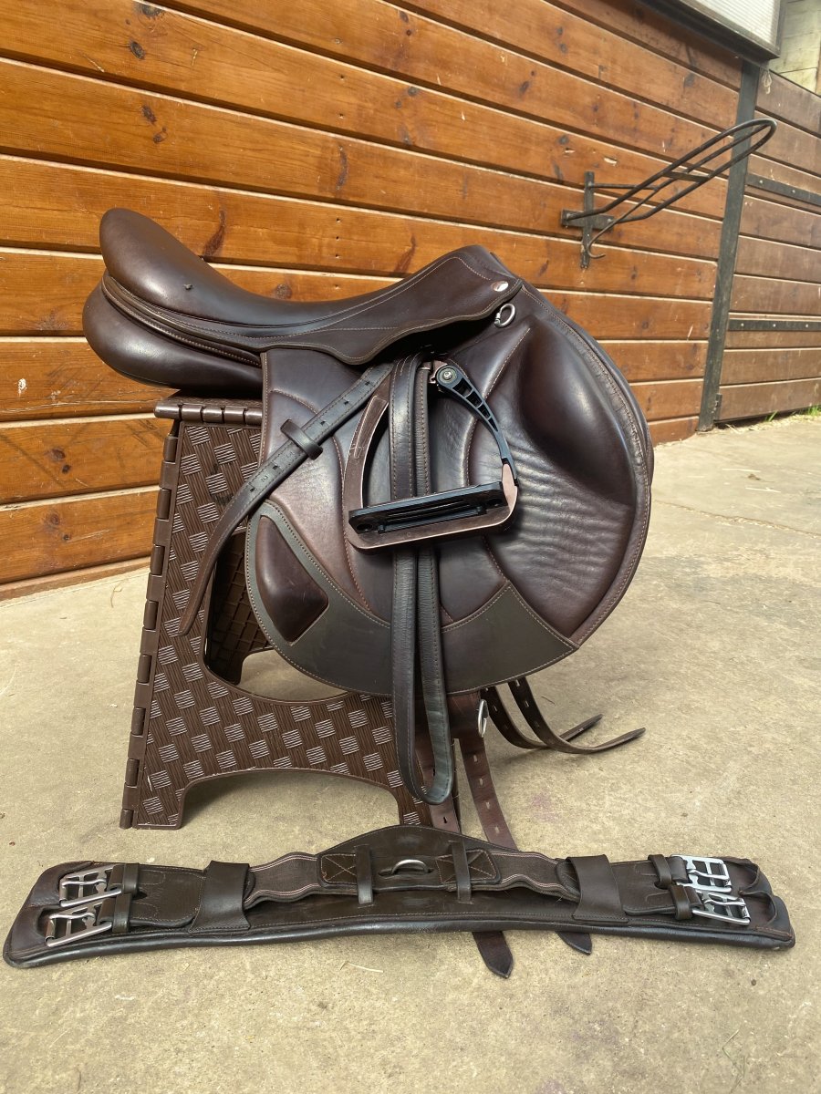 Продам седло Софт Ле конкур в сборе, в отличном состоянии, по всаднику 17,5 по лошади 33-34, ложиться на многих лошадей. В сборе безопасные стремена Акавалло, мягкие путлища 140см, подруга мягчайшая с гелем 65см.