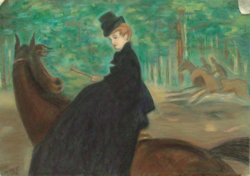 Под верхом (пока только на корде) уже сидела минут 10, наверное. Порысили в одну стороны минуты 2, потом в другую минуты 2. Шенкель почти совсем дошел до коня. По крайней мере остановка-движение шагом делается уже совсем без подсказки кордового. В рысь поднимается с более сильного двух-трехкратного посыла. Но уже понимает, что надо. Пытались уже рулиться чуть-чуть, подойти к кордовому, первый раз понял не сразу, второй уже было получше. Чуть-чуть пробовала рулить в рамках кордового круга. Пока не очень понимает, пытается упереться в повод вместо того, чтобы изменить траектрию.