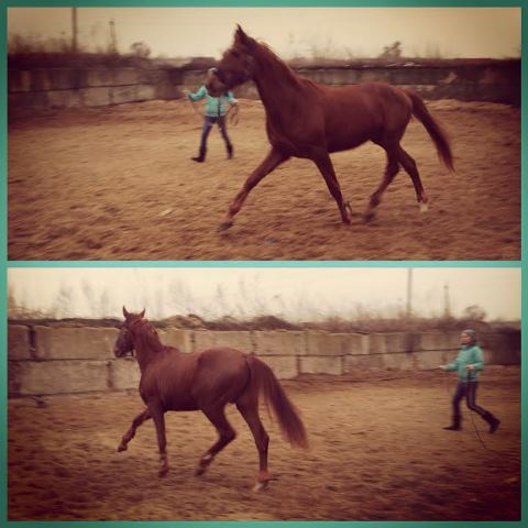 А мы по-тихоньку с мелким двигаемся дальше. Вчера вот уже рысили без корды на кордовом кругу. Конь, конечно, смешной, ведёт себя как ребёнок. Накануне носился как угорелый от переизбытка чувств, поэтому бегать вчера ему было лениво. Уши жмёт, когда его работать заставляют, а он уже подустал. Отстаньте от несчастного зверика!