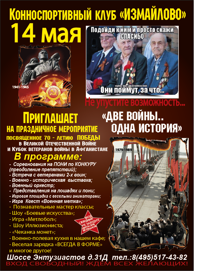 14 мая 2015 года Конноспортивный центр «Измайлово» приглашает на праздничное мероприятие, посвященное 70-летию победы в Великой Отечественной войне.