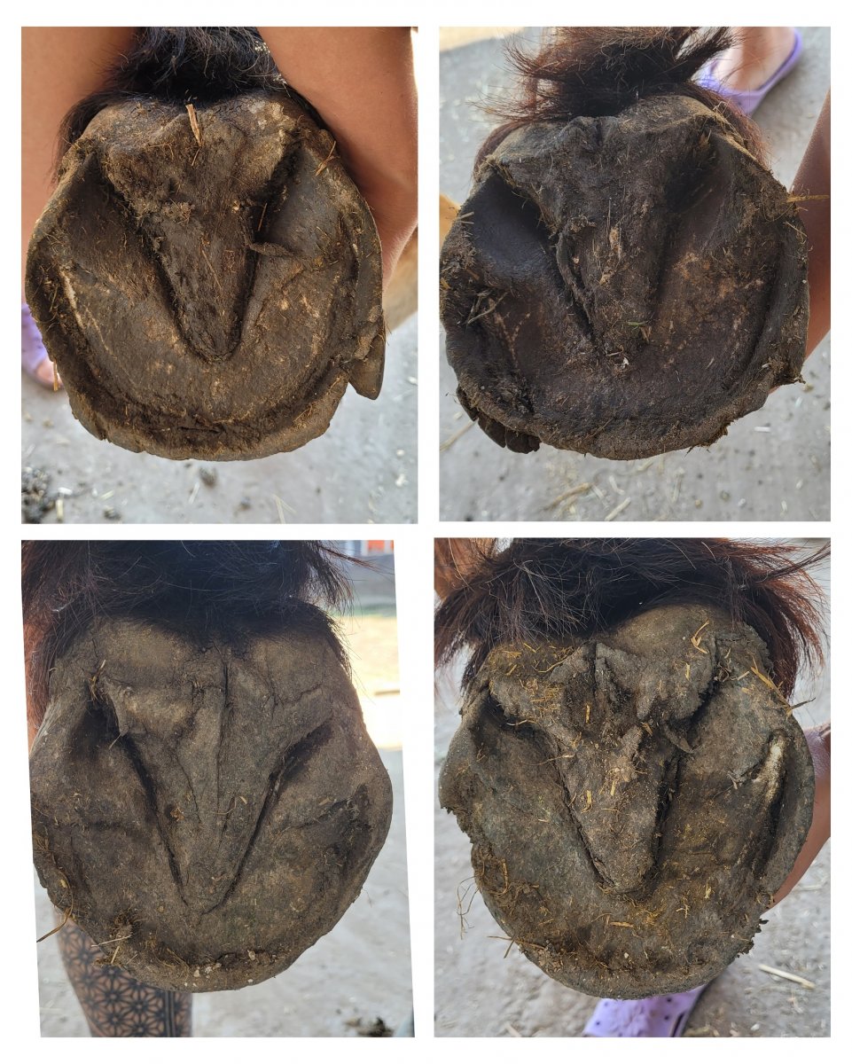 Прикладываю фото копыт, не расчищавшихся ровно месяц (без сделанного переката мустангов, с ним получше будет вид) для понимания объёма и проблем.