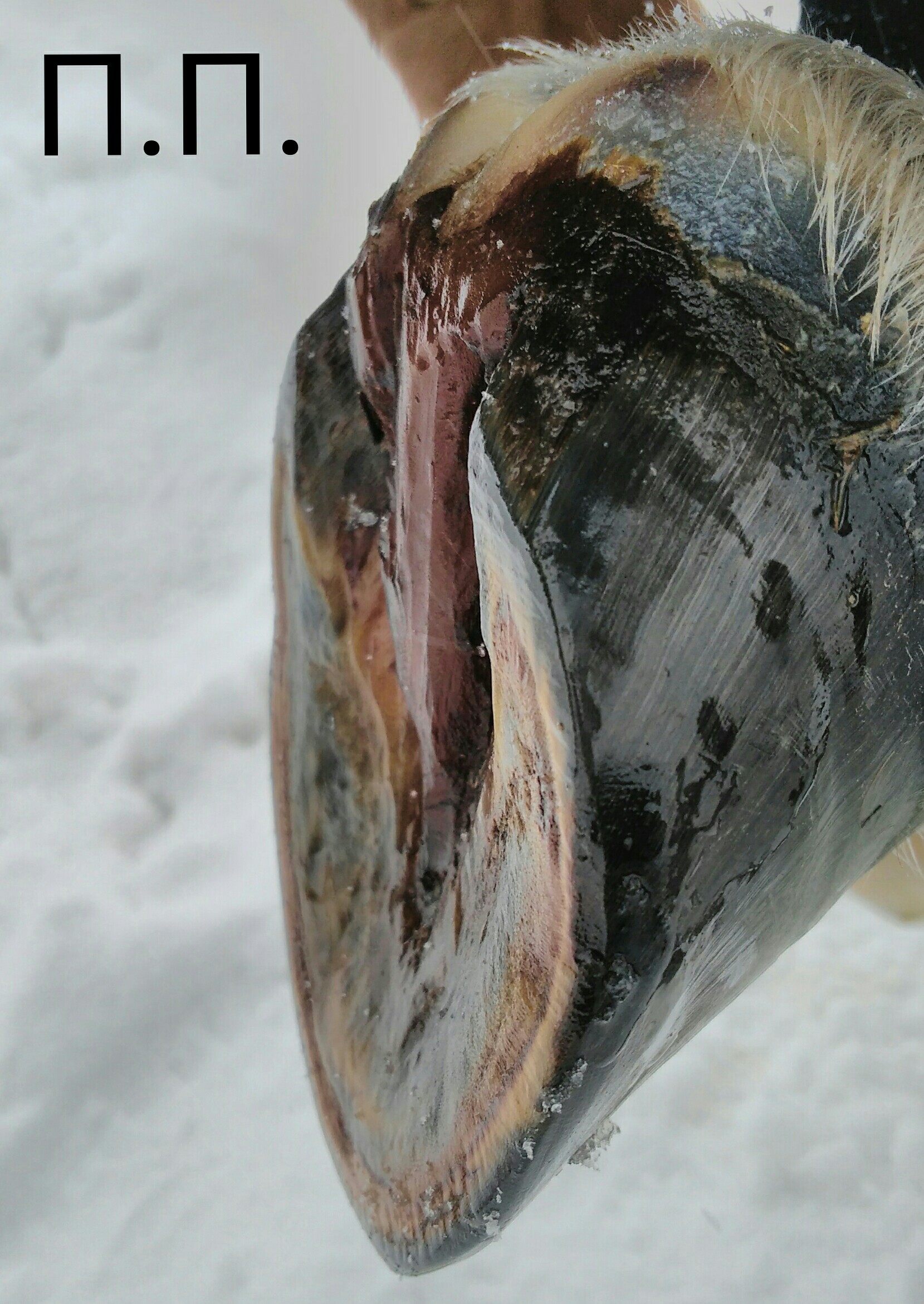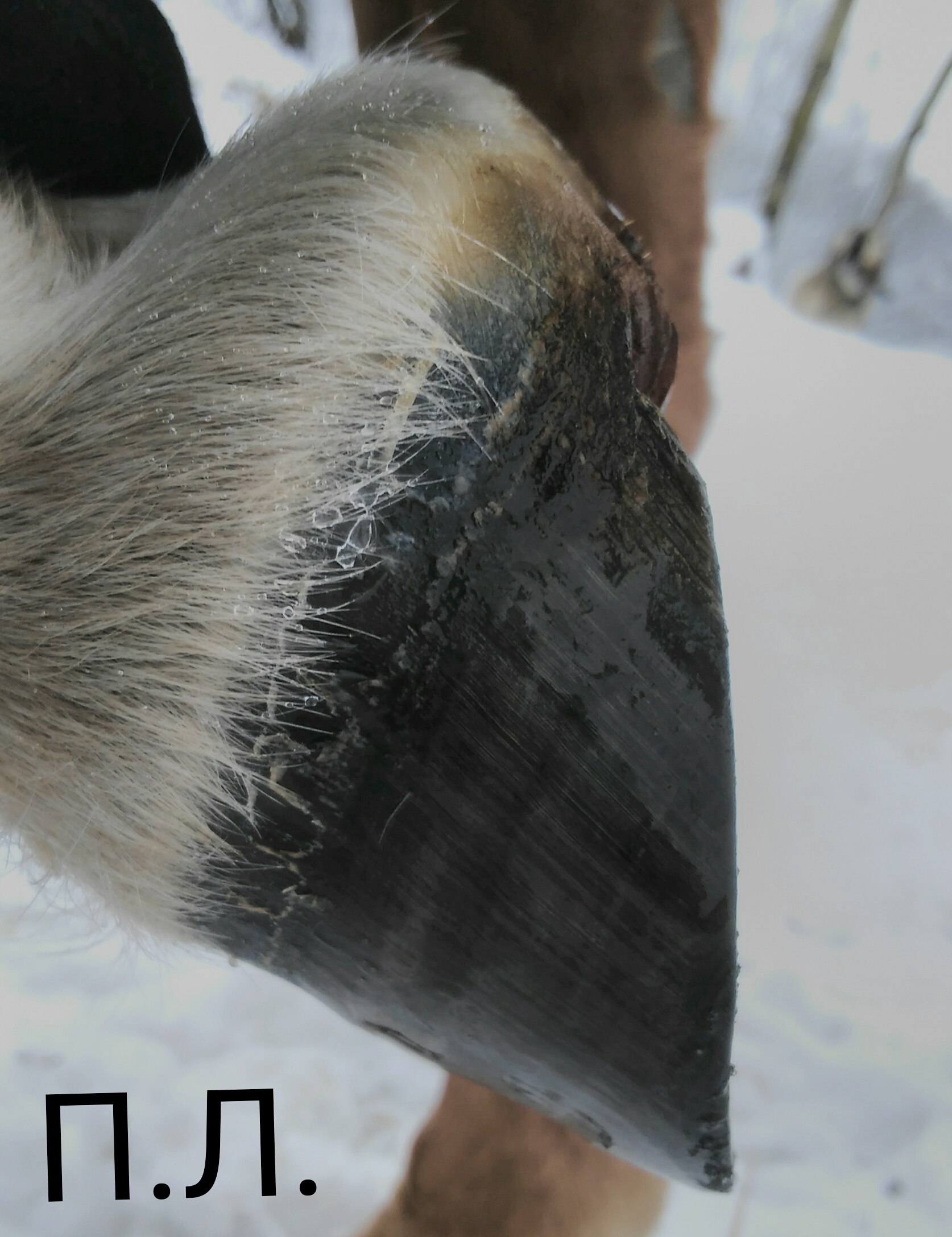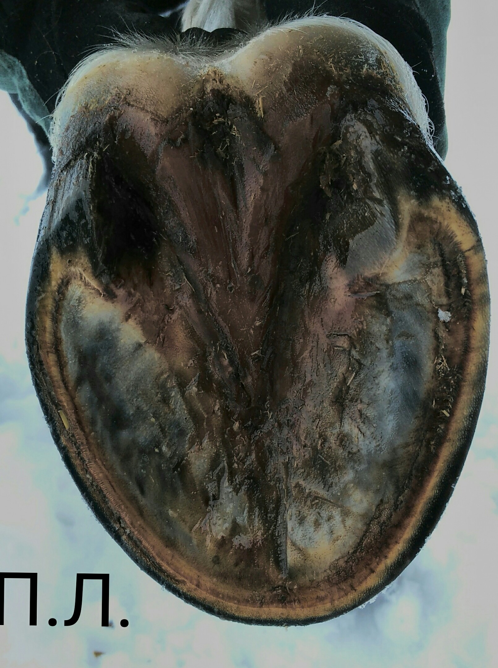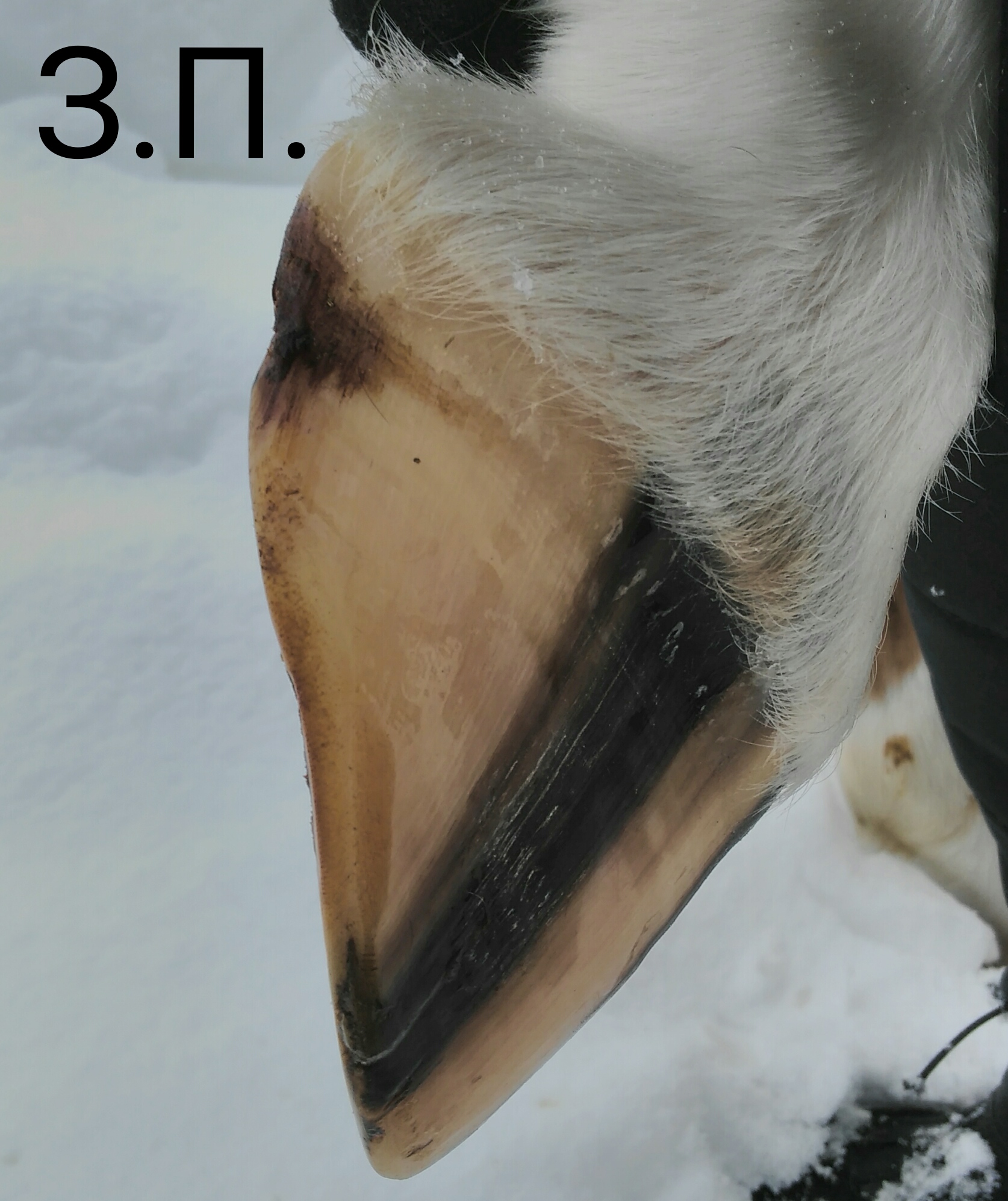 Полностью соглашусь с DM76. Нельзя резать только по углам. На фото очень плохо все видно. Но зацепы очень длинные и высокие на задах. Если поглядеть фото сбоку, то виден даже легкий "бычий нос". Плюс на фото задов, ну учитывая их качество, видно что подошва вровень с копытной стенкой. Это так? Если да, то не должно быть такого. Подошва должна начинать уходить в свод от копытной стенке.