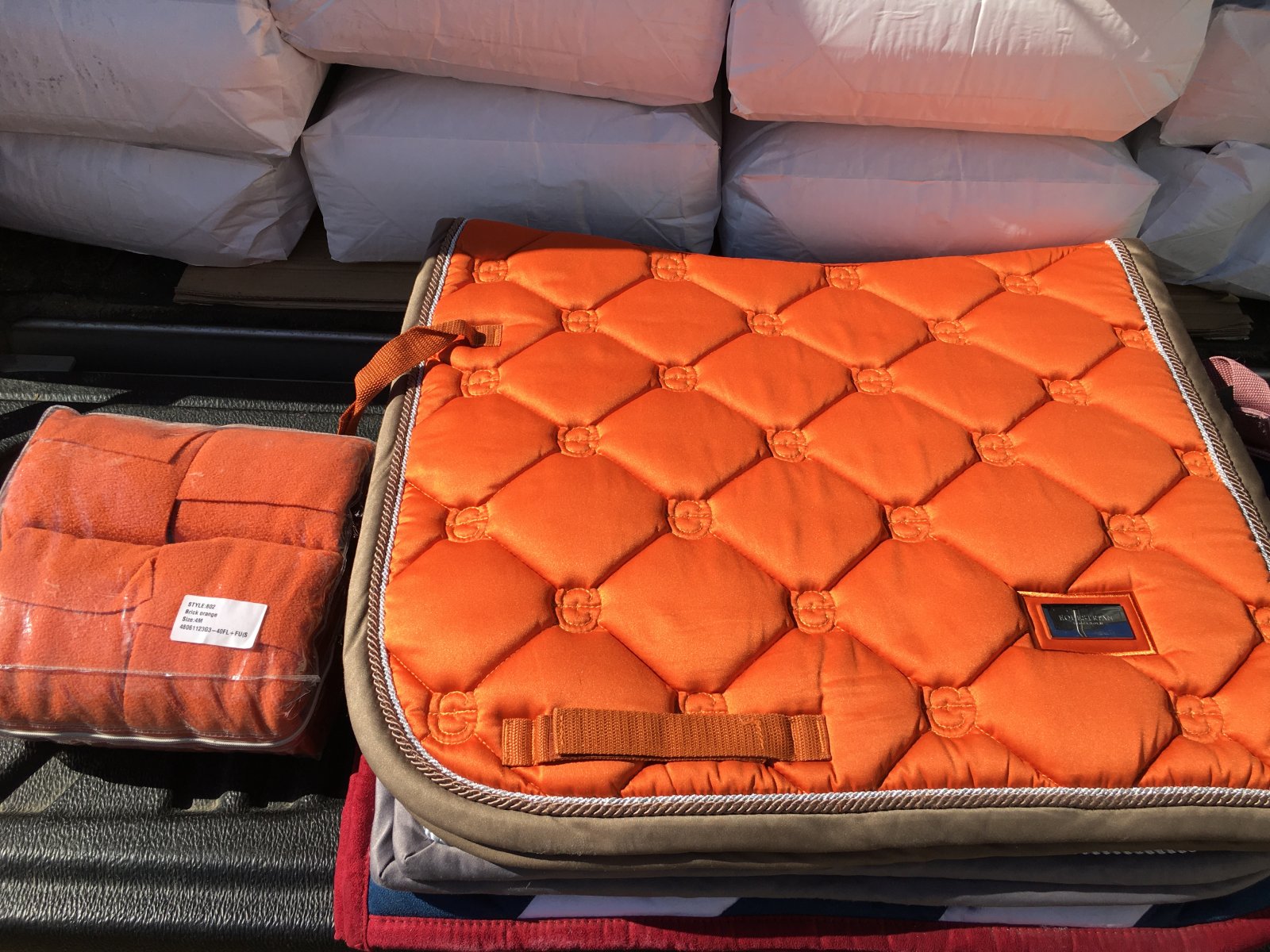 1. Комплект выездка Eskadron platinum оранжевый, вельвет. В комплекте стан бинтов из той же коллекции и пара колокольчиков размера L