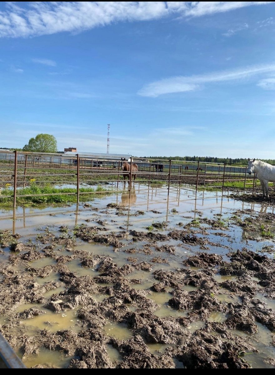 • Грунты - в левадах и дорожках к ним грунт это просто земля. Пару раз туда завезли песок и кокосовое волокно (и то, не во все левады). Осенью и весной грунт превращается в болото, в которое можно в буквальном смысле провалиться по колено. Добавки в виде песка и волокна благополучно перемешались с этой чачей и исчезли. Оставить там все свои ноги, потянуться или подвернуть что-то лошади не составит труда. В связи с этим кони "гуляют", стоя на островке из навоза, который хотя бы не засасывает так сильно. Зимой эта вся красота замерзает либо в неровные глыбы льда, либо, если бы дожди перед заморозками - превращается в идеальный каток, хоть коньки надевай.