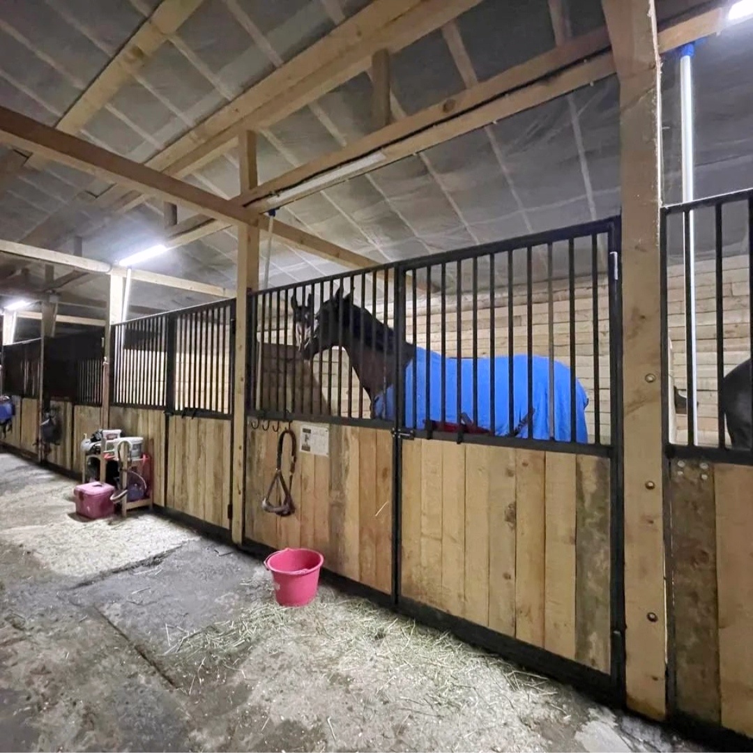 Сквозной проход 3 м. Денники 3,2*3,9 м с полузакрытыми перегородками - лошади имеют возможность общаться. По желанию коневладельца перегородку можно закрыть