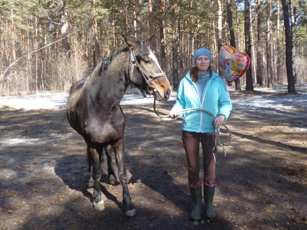 Проснулась поздно, то да сё... на конюшню начала собираться только часа в два... собралась и того позже... приехала в пять. :roll: Какая же меня обуяла лень! Хотелось выпустить коня в манеж и посидеть в сторонке. Но манеж был занят и освобождать его не хотели. Катя сблатовала поехать с ней в лес. Почистилась, поседлалась, пошли разминаться на лесной - только-только начали первую рысь... Катя выезжает в лес с прокатом, предлагает ехать с ней - ну уж нет, на это раз я хочу нормальную прогулку... без всяких угрызений совести, что подвергаю кого-то опасности. :? Размялись: 12 рысь - 8 рысь-галоп. Села. Выезжаю в лес - конь не очень хочет и на выезде останавливается типа "а может не надо" - НАДО - выталкиваю вперёд - пою... Буквально через 10 метров конь видит на дороге две лужи - небольшие, типа проталин, в виде рельсов... пытаюсь уговорить... конь резко разворачивается и несётся галопом в сторону конюшни... удаётся остановить только возле навозной кучи (скорее всего дальше конь и не планировал бежать). Разворачиваемся, и шагаем обратно - в лес. Перед лужами у коня снова ступор - двигаю - пролезает по сугробу слева от тропинки - идём дальше, поём. :roll: Пошагали, начали рысить - всё нормально. Периодически конь предлагает быстрее - сдерживаю. То и дело пугается выступающих из под таящего снего частей грунта, деревьев... но двигаемся вперёд. Сделали две рыси с отшагиванием - конь к этому моменту уже был мокрый (вряд ли из-за работы, скорее из-за длинной шерсти и нервов), вышли на галопную тропу. Поднимаю в галоп - скорость непостоянная, но не летит. На спуске без проблем перевожу в рысь и затем снова поднимаю в галоп... И вдруг Ку взглядом зацепляется за какую-то чёрную кучу непонятно-чего слева на дороге... "Зацепляется" - это именно то самое слово, потому, что не меняя место расположения головы (как-будто его верёвкой держит возле этой кучи) он резко разворачивается и бежит в обратную сторону... Останавливаю метров через пять, разворачиваю и снова идём на кучу, на это раз шагом - преодолеваем её по снегу справа, отходим метров на пять - поднимаю в галоп и скачем дальше. В какой-то момент конь так не слабо припустил типа "ты хотела галопа?" (не считаю, что это можно назвать разносом, потому что изначально аллюр задавался моей командой и ухода от заданной траектории не было), но неожиданно мы доехали до перекрёстка - предполагаемой финишной точки, и я без особого напряга перевела в шаг.