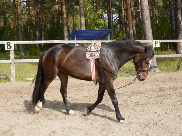 Естесственно решила одеть вестерн! Ох, и намучилась же я... Раза три пересёдлывала на коновязи; то затягивала, то расслабляла подпругу. Когда уже всё было готово и я даже надела уздечку, начался дождь и решили немного переждать... Сняла уздечку, расслабила... Затянула. Перед самым выходом с коновязи упала железная перегородка - конь испугался и прыгнул прямо мне на ногу - отдавил конечно же :? Когда наконец-таки вышли в манеж, поняла, что несмотря на потраченное время, седло всё-таки уехало назад, пад перекосился... и я решила всё переделать... в процессе переседловки уронила седло, пад, напугала коня... В-общем, на лицо прогрессирующая криворукость... :roll: Заседлала - всяко лучше, чем в прошлый раз, но что-то меня смущало (с универсалкой первое время была та же фигня). На корде вестерн-седло смотрится очень непривычно - зад, кажется, отходит вверх от конской спины (под всадником он придавливается весом и лежит плотно, а на корде - отходит), не критично конечно, но вторая подпруга была бы кстати... :?: Сделали в качестве разминки 10 шаг и 2 по 5 рыси, сели и поехали в лес, в компании с другой лошадью конечно же. На этот раз в планах было поездить подольше и попробовать рысь.