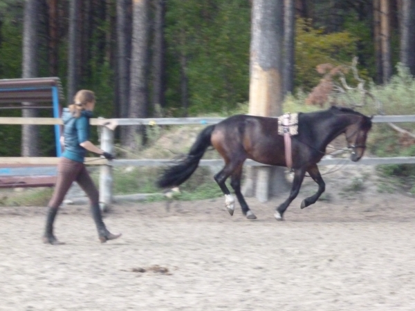 Замечательнейшее занятие с тренером. Не перестаю восхищаться её выдумке в плане разнообразных и неожиданных для меня упражнений, а также терпению... На этот раз на корде просто отшагали, и я сразу села. Сделали пару кругов рысью - видимо, чтобы оценить степень адекватности коня - пойдёт. :) А дальше... Ноги из стремян! - Руки в стороны! - Руки вверх! - Руки на пояс! - Повороты корпусом! - Руки за спину! - Рысь облегчённая! - Рысь учебная! - Раздвинуть! - Сократить! ... Галоп! - вот тут я слегка замешкалась, переспросила тренера, для верности взяла в одну руку гриву, и подняла в галоп... ощущения непередаваемые! в конце я даже таки поставила обе руки на пояс! :) Без повода ощущение лошади и собственного равновесия совершенно иные... Потом прыгнули несколько раз на корде через гимнастическое препятствие (20-30 см): конь - молодец! я - хуже: то опаздываю, то зачем-то подаюсь вперёд, но поводом, вроде, не дёргаю, т.е. плохо конечно, но не криминально. :wink:
