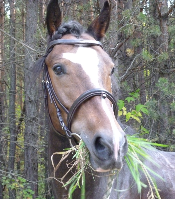 А потом... мы пошли шагать... в лес... ОДНИ, совершенно одни. Вот это точно впервые! Конь повёл себя мужественно и постарался максимально извлесь пользу: всю дорогу ел (и это при затянутом капсуле!). После тренировки вначале отпустила коня в манеж, а потом просто - попастись, минут 20, пока я собира-убирала седло и прочие орудия "воспитания" коня. :)