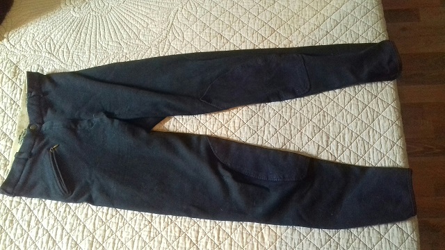 4) бриджи на невысокого всадника: ПОТ 33, длина бокового шва 86 см, цвет синий с коленной леей из искусственной замши, ткань х\б - 400 р.