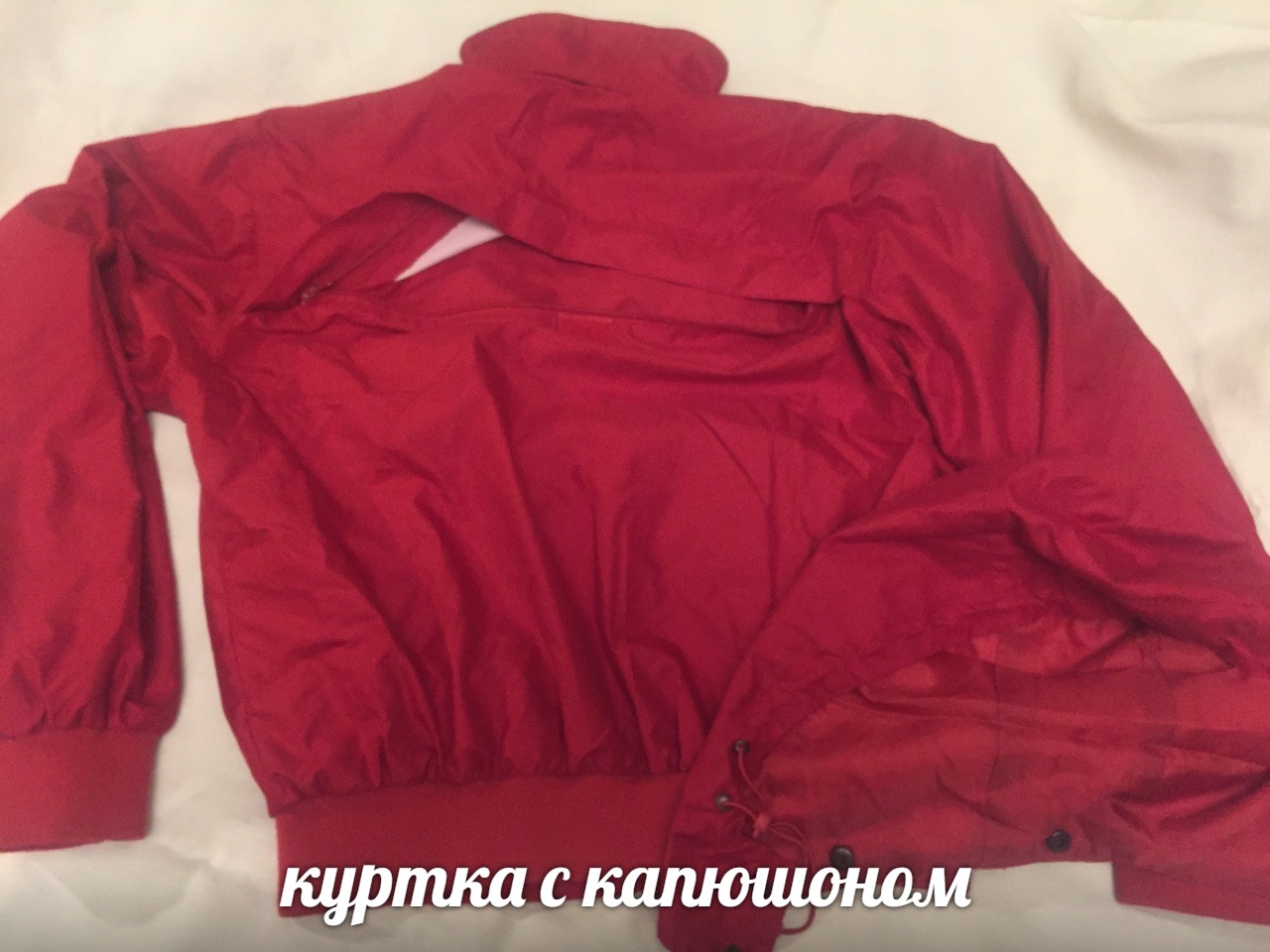 Красная ветровка из плащёвки, 2 кармана снаружи на молнии, ещё 3 внутри, манжеты на рукавах и резинка на поясе. Молния расстёгивается сверху и снизу. Капюшон на кнопках, убирается в карман на спине. На размер 46-48.