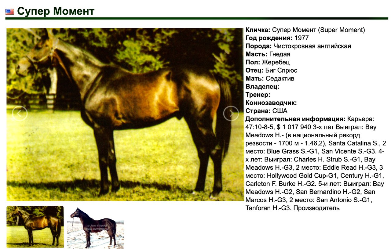 По отцу внучка знаменитого Супер Момента, жеребца американского происхождения, установившего несколько рекордов резвости.