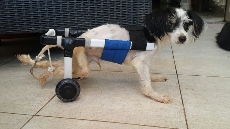 Черес 3 месяца муки стал ползать на передних лапах и мы зделели ему коляску.Его счастью небыло границ, он стал носится по всему дому и зучать все закоулки.
