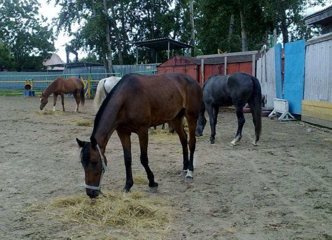 На фото - маленький табунчик с Лозой на переднем плане. После обеда некоторых кобыл и меринов выпускают погулять на плац.
