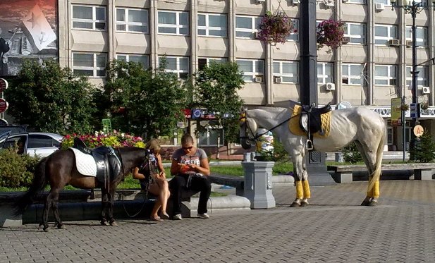 22 августа снова ездили сменой. Шаг, рысь, вольты, смена направления, строевой, полевой и тут тренер решила потешиться и дала команду "галоп". Есть у меня отрицательная черта, когда во время тренировки случается что-то новое, я впадаю в кратковременный ступор.. Зато Лоза в ступор не впадает :lol: Пока я тормозила, смена ушла галопом вперед, тело подчинилось команде "отомри", выслало кобылку в галоп и она ПОЛЕТЕЛА догонять своих. Мы красиво догнали впереди идущих, заняли свой третий номер, но не тут-то было, лошади не хотели идти строем, это было похоже на дикие скачки, какие-то. Головной был Демон, у него ноги длинные летел как пегасина, следом Лунная Ночь, тоже длинноногая, потом мы с Лозой, усиленно пытались не отстать, за нами Марк. Лоза летела выкладываясь полностью, если я пыталась ее притормозить - начинала мотать башкой, поэтому я оставила попытки. В какой -то момент на повороте Лоза увидела, что Марк идет к ней очень близко и попыталась козлануть, я не удержалась и вылетела ей на шею. Еду я, значит, у Лозы на шее и анализирую: ноги остались в стременах, можно попытаться сползти в седло, в седло не сползти - передняя лука мешается, лошадь моя несется за Демоном и останавливаться не собирается, если я сейчас попробую с нее прыгнуть - запачкаюсь, а бриджи только постирала.. буду ехать так, пока сама не остановится. Обняла я ее за шею покрепче и вроде даже пыталась рулить корпусом, чтобы она в поворот вписалась. Через некоторое время до нее дошло, что что-то не так и она перешла на рысь, а я благополучно оказалась в седле. Проехали мимо тренера, она спросила: "Адреналин ловишь?" Я задумалась, и оказалось, что адреналина нет, не испугалась совсем и думала о какой-то фигне в тот момент. Решили повторить галоп, во второй раз получилось лучше. :lol:
