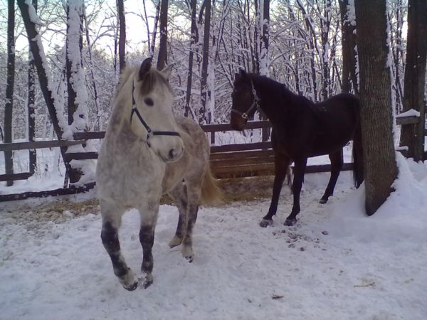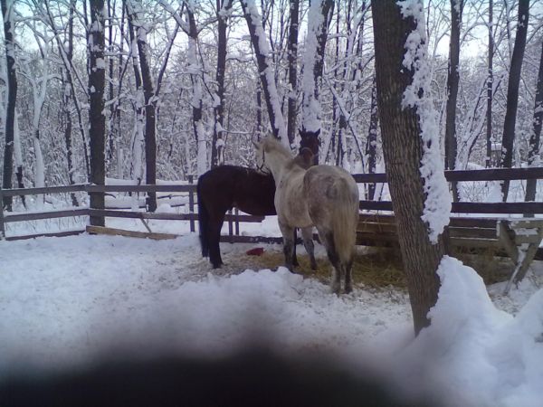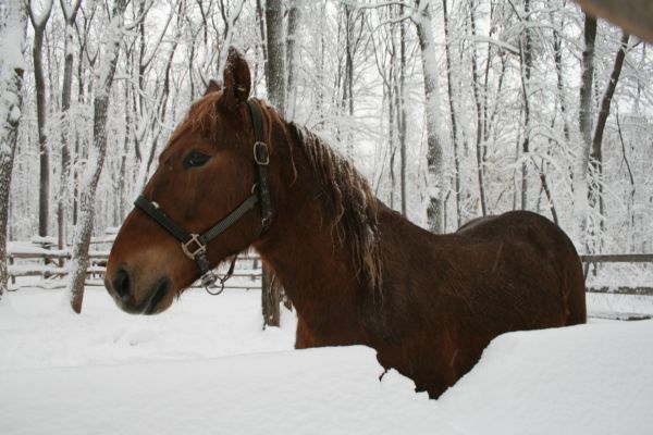 Погода была вполне прекрасная - если любоваться на неё из окна - снег падал... уже часов, наверное, десять к тому моменту, когда принцесса в моём лице была разбужена сообщением о том, что коневоз приехал. Приехал - и буквально возле конюшни застрял в этом самом уже много часов красиво падавшем снежке. А потом, при попытке вылезти, вообще сломался. И лошадь выгрузить невозможно, потому что застряло и сломалось всё тоже очень красиво - почти упершись задом в навеки осевший в тех местах старый автобус.