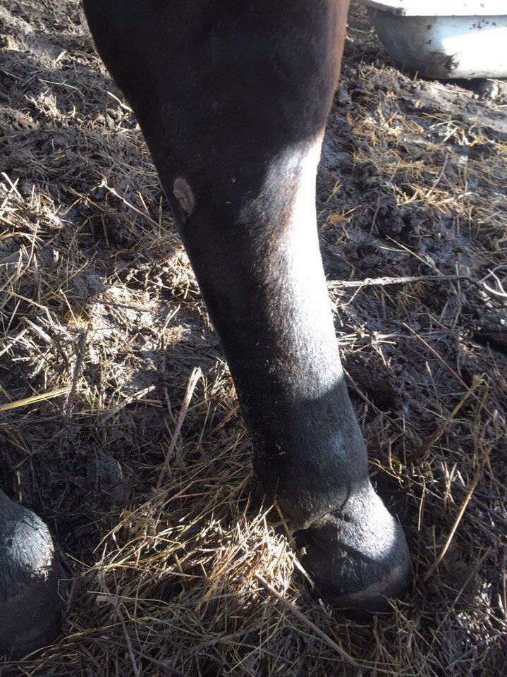 УЗИ появилось только спустя 2 недели после травмы, до этого лошадь стояла в деннике. Первую неделю отекали все 4 ноги, частично из-за травмы, частично из-за того что лошадь стояла.