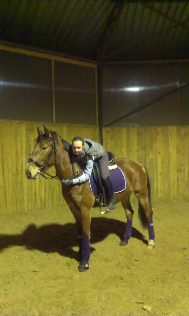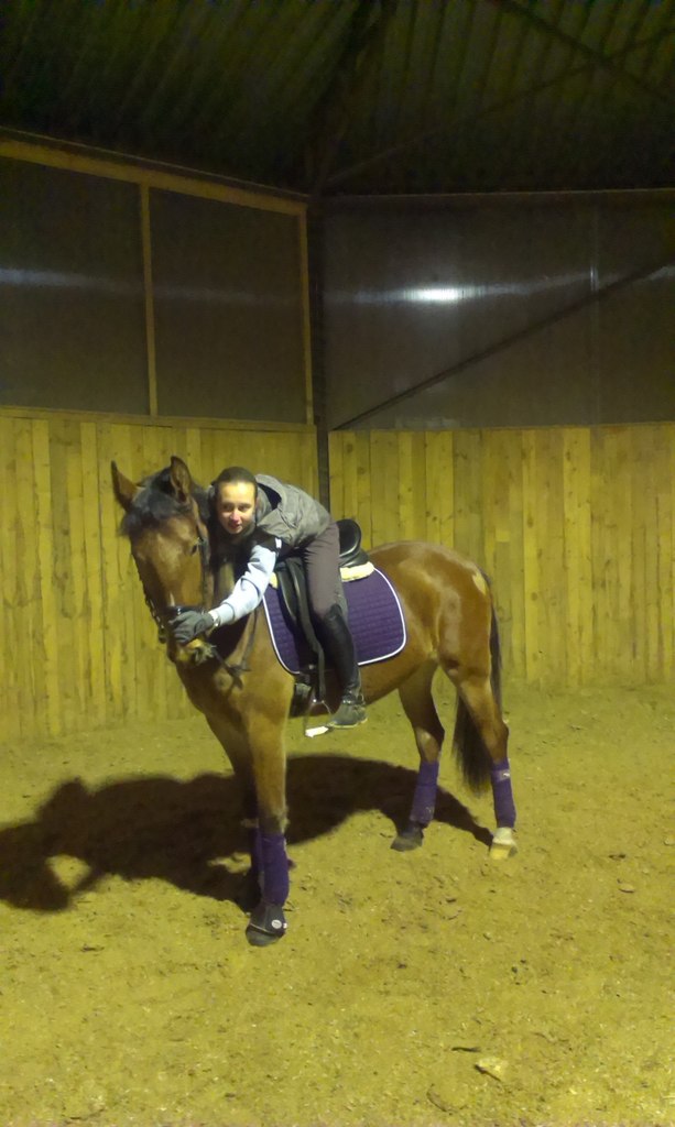 Приехала я на конюшню и решила сразу взять Мисс. На что та радостно отреагировала. Сделала все что от нее просили. Я нахвалила ребенка и начала шагать, и заодно повалялись . Потом было занятие с Аней. В итоге Аня только успевала говорить подними голову, и не смотри на коня , он и без тебя хорошо бежит. Потом тося сделал шикарную прибавку , нашему счастью не было предела. Жалко кое-кто этого не видил. На галопе я пыталась сесть и сидеть. В поворотах получалось отлично. Так же поделали плечи и уступки. Вообщем всю тренировку мы болтали и смеялись. Анька старается отвлекать меня. Вот как то так и живем