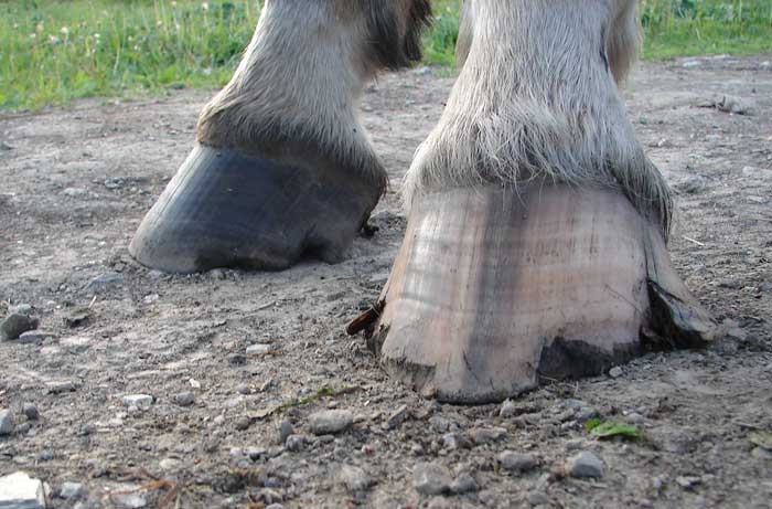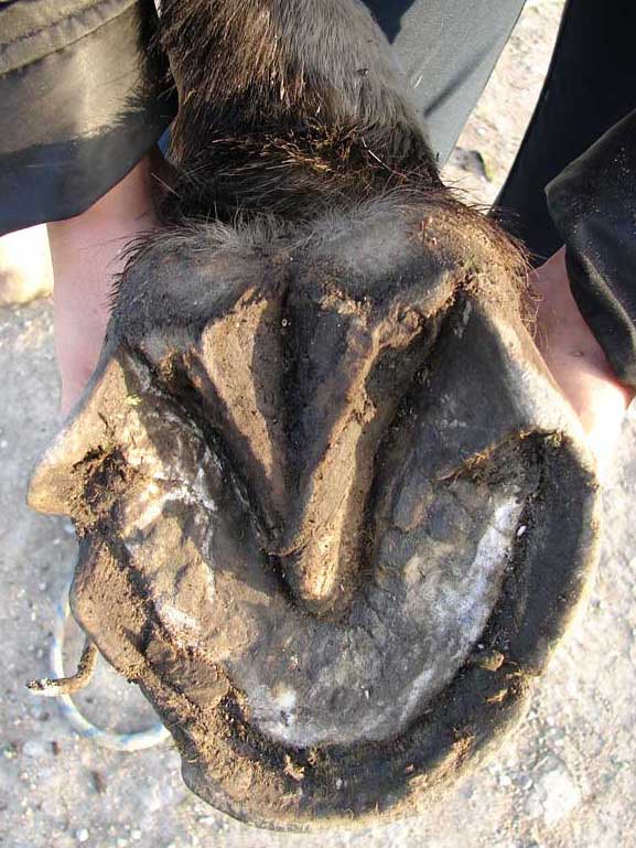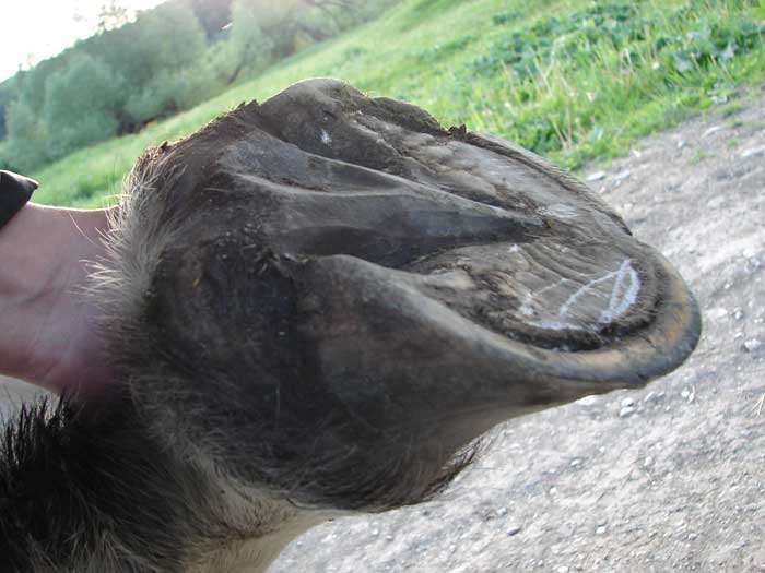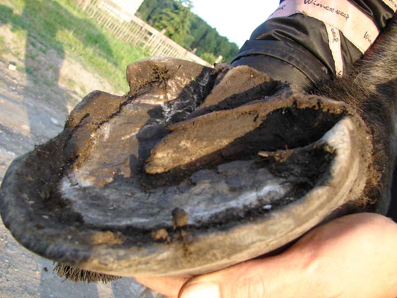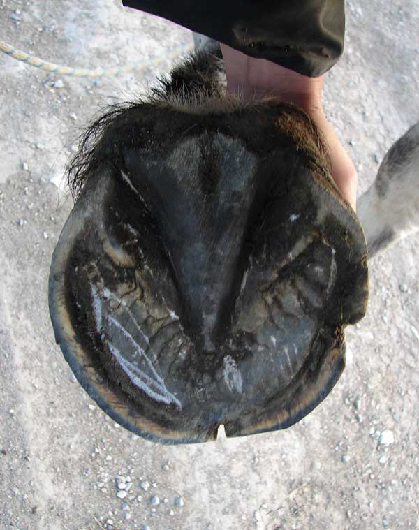 Вот про подошву, кстати....Теперь кобыла хромает на правую...А дорогу, на которой она стоит, которая разделяет наш дом и поляну, она переходит теперь так: вытягивает нос, потом тянет ногу вперед, как будто пытается на цыпочках перебраться и прихрамывает. Как ей ходить на подошве? А стрелка, жалко что фото такие корявые, стенка получается выше стрелки на полсантиметра где-то и заворотные углы не чищены...Срочно возьми рашпиль и пили. Невооруженным взглядом видно расклешение на передах. Сделай так, чтобы стенка совсем не касалась земли (особенно ЛП), пили до белой линии, водяную (которая белого цвета) тоже спиливай. Пусть ходит на подошве со стрелкой.