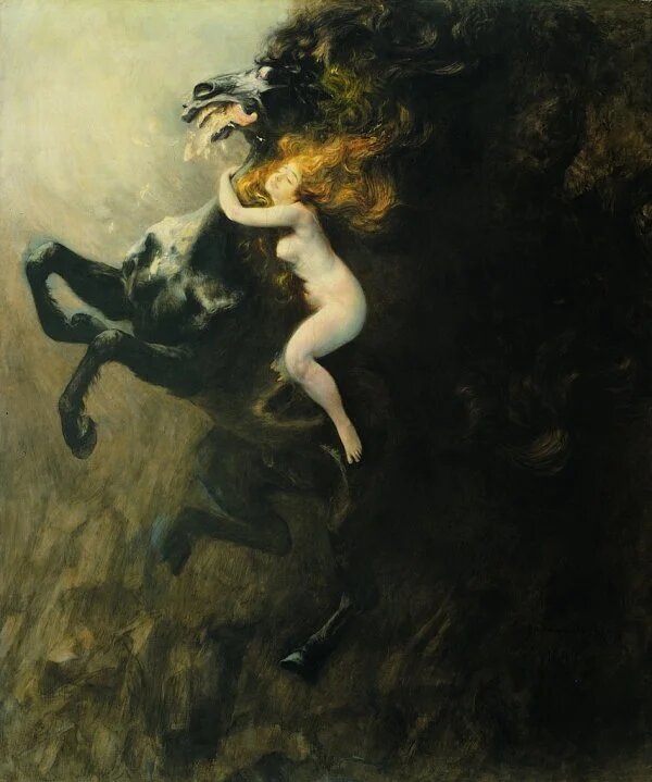 Коню явно не по себе. Первое название картины "Безумие ликований". Конь сошел с ума, а женщина в экстазе)Ну конь..... Все как всегда