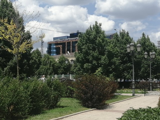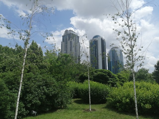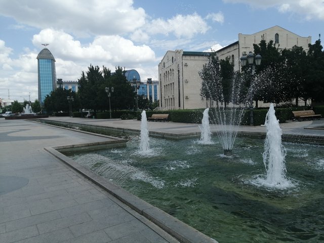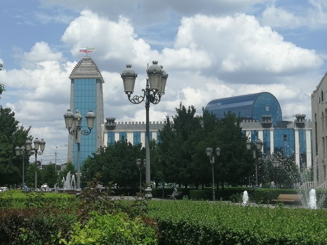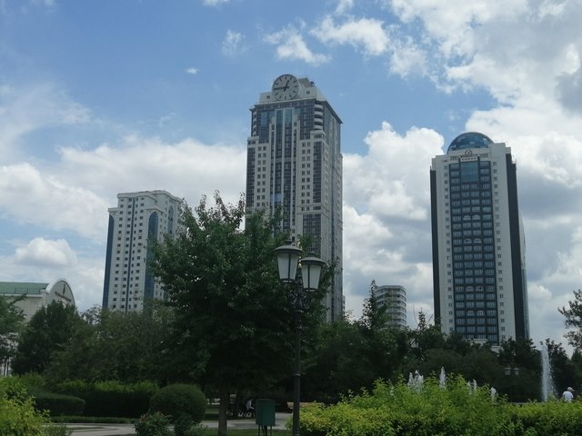 Город лежит в котловине, там всегда немного более душно, чем наверху. Погода была - тридцать градусов в тени и солнце (тогда как в Назрани - всего +18), и изначально мы планировали передвигаться по городу на машине. Но в итоге план поменяли, доехали до центра, группы высотных бизнес-центров, очень похожих на нашу Москва-Сити, там оставили машину и дальше гуляли пешком.