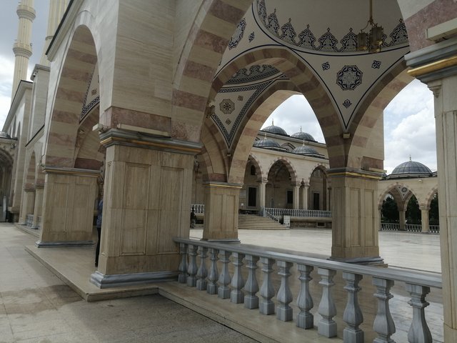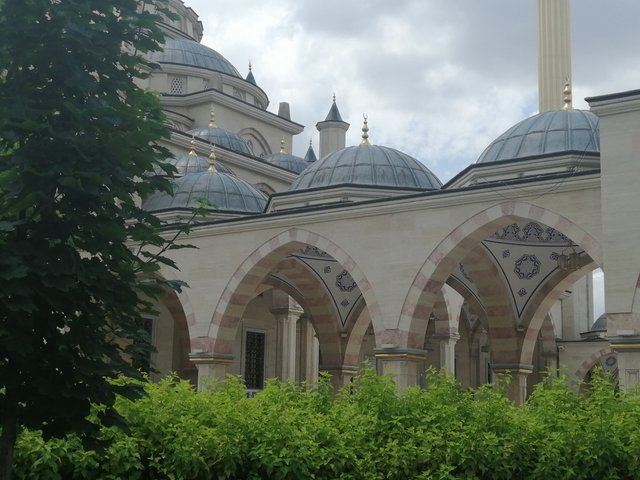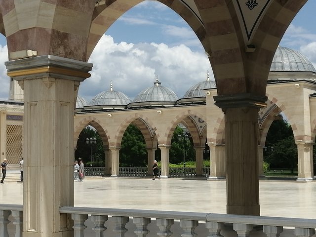 Муса человек религиозный, к мечети мы подошли аккурат к полудню, и меня оставили в парке со словами "Я пойду помолюсь, а ты пока погуляй здесь". Да, конечно, погуляю... И только Муса ушел - раздался азан, призыв на молитву. Первый раз я песнь мулы слышала в Казани несколько лет назад, и это были настолько сильные эмоции, не передать словами. Что-то глубинное в душе цепляет сильный красивый голос, на который хочется идти, позабыв, где ты и кто ты. Там и тоска по вечности, и почетание Бога, и стремление к просветлению... (впрочем нет, просветление - это из другой сказки). И вот - это всё разносится под знойным небом Чечни... Волшебство.