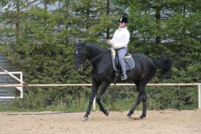 Сегодня с кобылой делали интересную связку : ездой налево полстенки галоп, переход в шаг и полстенки плечо внутрь, снова подъем в галоп и снова переход и плечо. От меня требовалось не зажиматься, а сидеть глубоко и расслабленно, минимум руки и вести седло. И даже что-то получалось чуть-чуть.