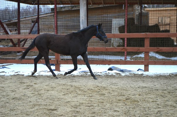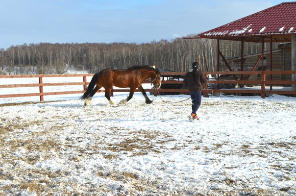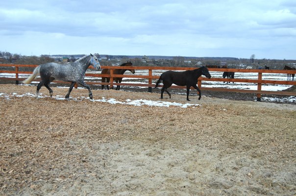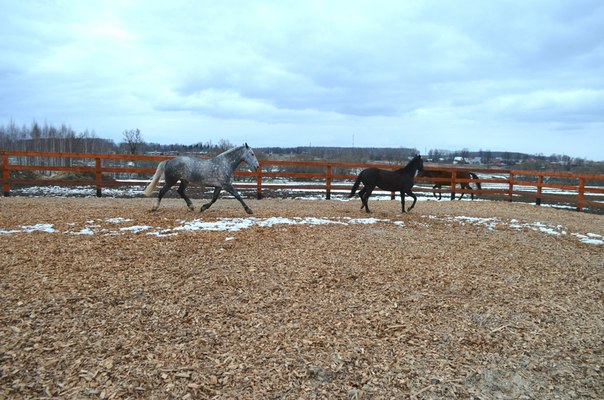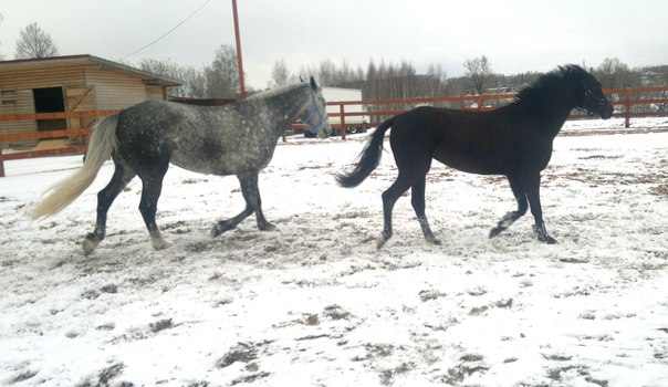 нужно подумать :) сегодня утром оценила шутку природы!пошутила так пошутила!решила не поеду...потом окончательно проснулась собралась и понеслась к своей серенькой :lol: на удивление дорога было хорошая!я вот ожидала что там будет снежная каша...ан нет!даже в некоторых местах была совершенно сухая :shock: весь экстрим был только на нашей пьяной дорожке)))))приехала все стоят в конюшне так как был снегопад и лошадок намочило и по этому с обеда они стояли по домикам и жевали сено :) пошла к Манюне)блин соскучилась не видела её с субботы :roll: прогуливала...принесла ей обед!кушает все хорошо и тут на половине трапезы-бац ногой по тазику и все блин перевернула :evil: вот набралась дурных привычек!никогда так не делала пока не подсмотрела у соседки напротив :evil: аж бесит...все г...о перенимает у всех нет бы хорошему училась...собрала все вместе с опилками и унесла не умеет жрать по нормальному пусть стоит без обеда...приступили к чистке...мадам явно валялась хорошо что не в грязюке..почистила поставила ждать пока я почищу Белку.сегодня решила работать их вместе в свободе..такой шанс можно только в будни урвать так как на выходных много народу приезжает а вот в будни нет никого почти.пошли с девками на плац думаю сейчас они мне устроят йу-ху!будут показывать как они вертуозно меня не слышат...ан нет!работали просто умнички!забавно было наблюдать как Белка если немного отстанет галопом обгоняла Манюню лишь бы первой бежать!еще и козлов ей показывала!вот козявка характерная!хорошо Манюня к ней относится по матерински а то получила бы за своих козюль :lol: фото не очень так как с телефона