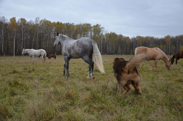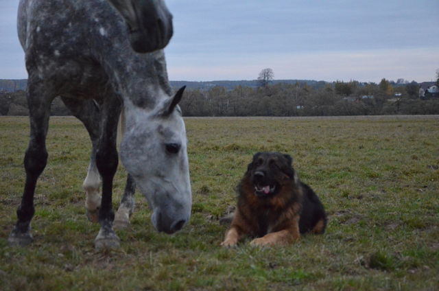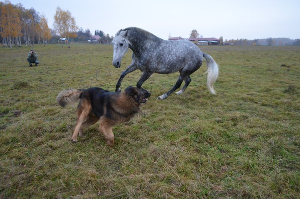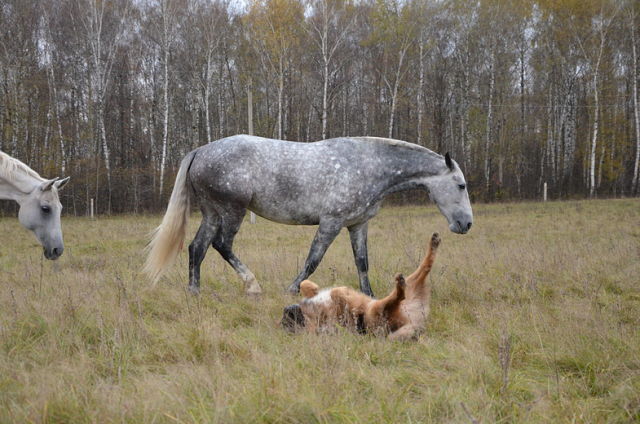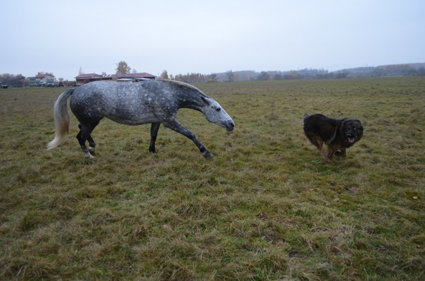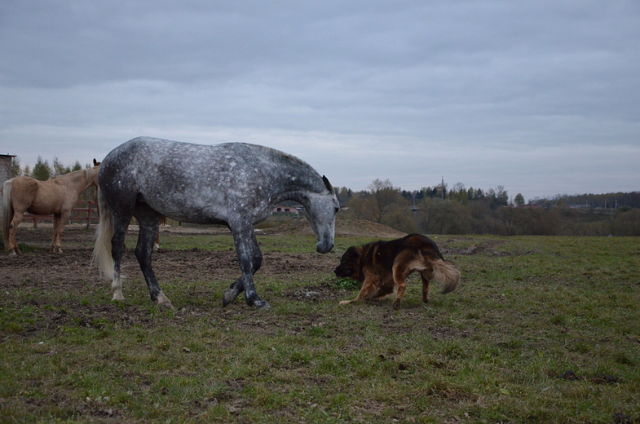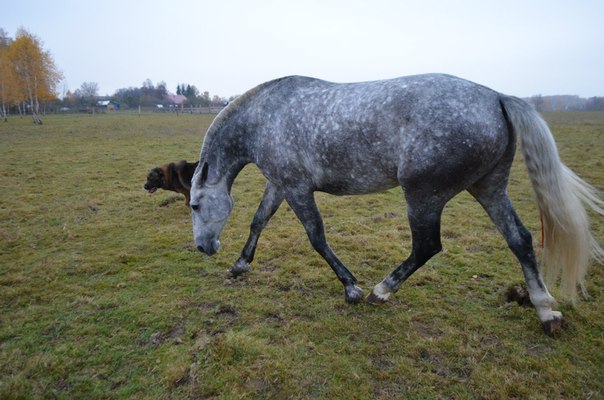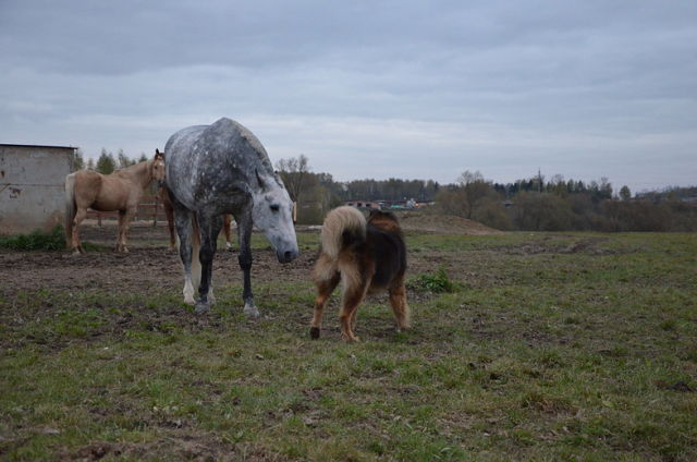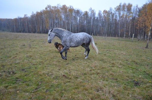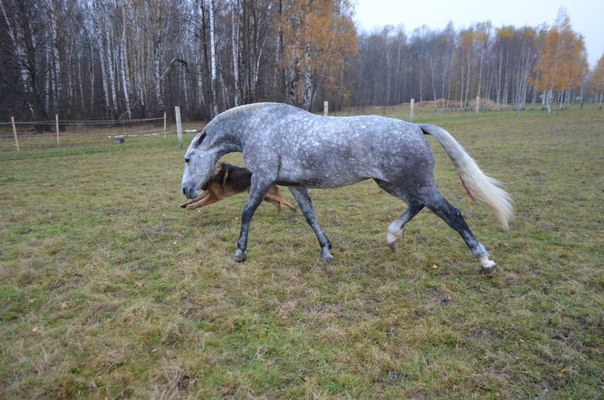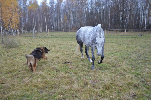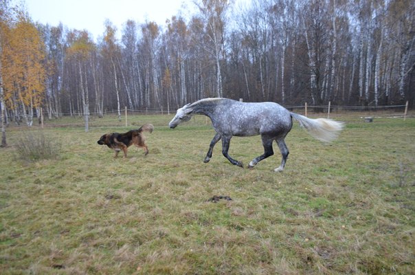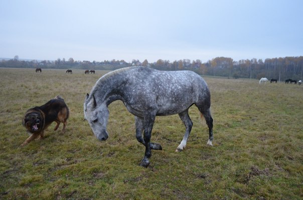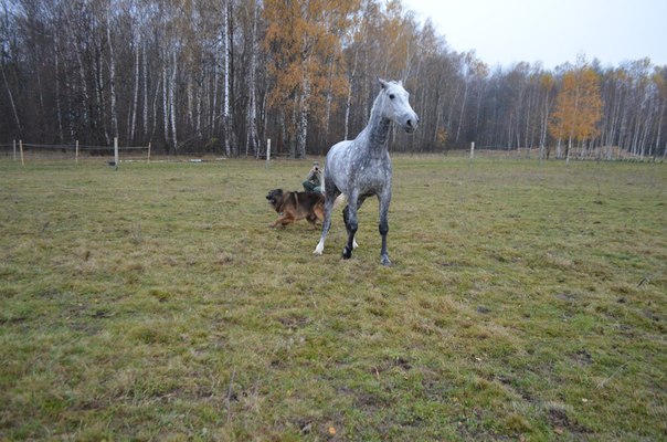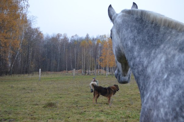 уехала в пятницу с утра к Манюньке!и осталась там ночевать...ездила верхом в дальнее поле.....а там трава зеленая как весной!и Манюня такая вся расслабленная и я вся расслабилась....погуляли...как давно мне хотелось вот так сесть и поехать в поле верхом.........и вот я могу это делать и мне спокойно и комфортно...я рада что вот такая она вся спокойная и мудрая...не по возрасту...или может быть ей тоже со мной спокойно и комфортно...надеюсь на это конечно...с утра снимала как они играли с Роськой))))))но в большей степени там охранная система у Манюни сработала мамка ту-та!и этот собака к ней подходит!вот не порядок!а Роське интересно с ней носится и он подбегает и с веселым лаем подбивает на беготню))))))) потом мы занимались своим делами а лошарики своими!вот моя и получила за свою деятельность!у нас там трап метра 2 в высоту есть....так вот моя лошадка решила туда залезть и посмотреть на всех с высоты птичьего полета :lol: я чуть дар речи не потеряла :shock: наругала...ак она задом-задом и слезла оттуда!вот ведь чудо!то в корыто залезет то на трап!вот научила блин не боятся так она теперь все разведкой занимается!потом на закате ходили на дальнее поле траву кушанькать....она там зеленая как весной!лошадки молотили её без остановки!с нами ходила еще Настя с Снежкой и Танюшка с мешком)))))))))))так как Тибулка на больничном и стоять еще месяца 2...вот и нарвала ему мамка травки))))))
