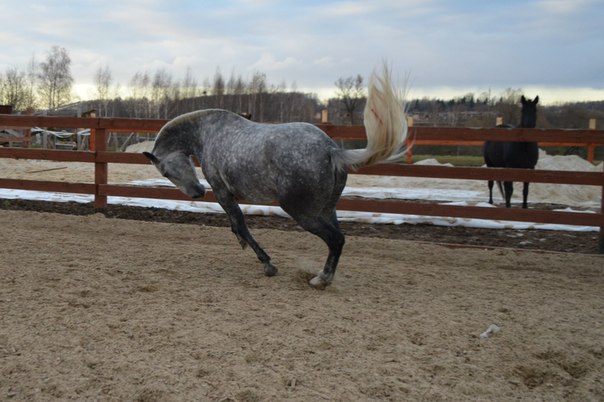 вот приехала от моей козюли)))))))работали на плацу вроде все хорошо...но вот под конец ложку дегтя таки добавила моя злыдня.....пока не прочитаешь ей мораль по поводу включения мозгов...она блин делает вид что нифига не знает и не помнит :evil: зловредина блин :roll: но вот побегала она сегодня весело)))))сначала дала ей пары выпустить только потом работали...вот ведь она такие козюлины крутит!все время поражаюсь!!!!!!!!такая большущая лошадь а сворачивается в клубок или как змеюка шею вывернет :shock: вот они умеют однако :lol: