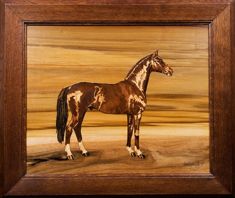 Вид искусства называется маркетри. У меня дома стоит одна из работ с лошадью, постараюсь во всех деталях заснять.