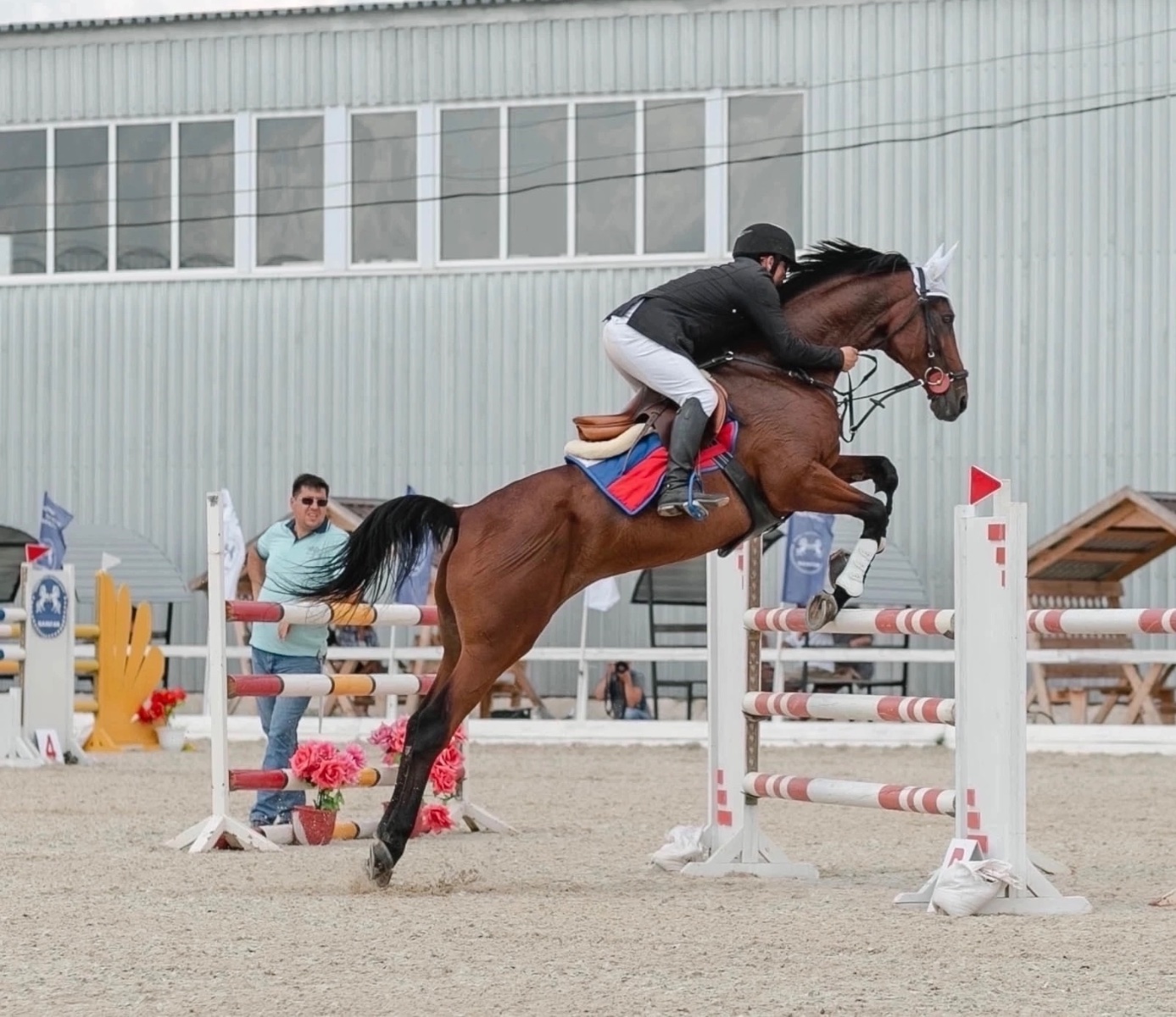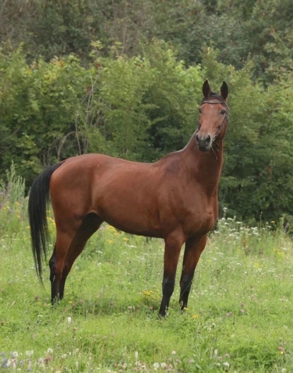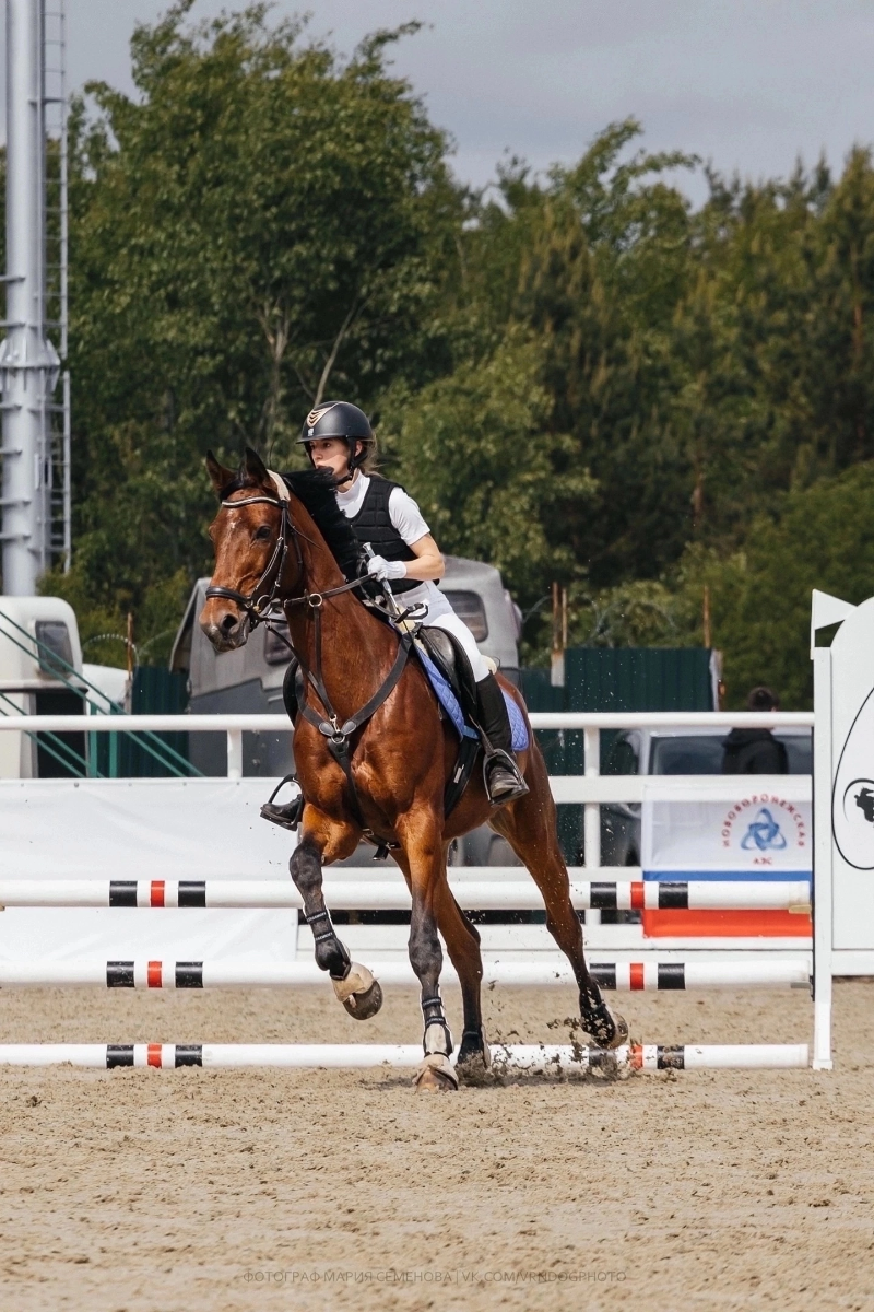 Имеет стартовый опыт по маршрутам до 105 см, на клубных до 120 см, под ребенком до 90 см. Активный, общительный, мягкий на руку.