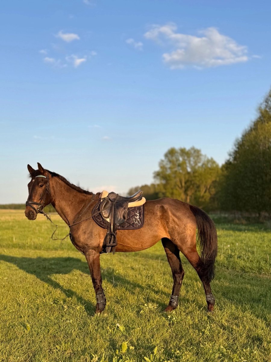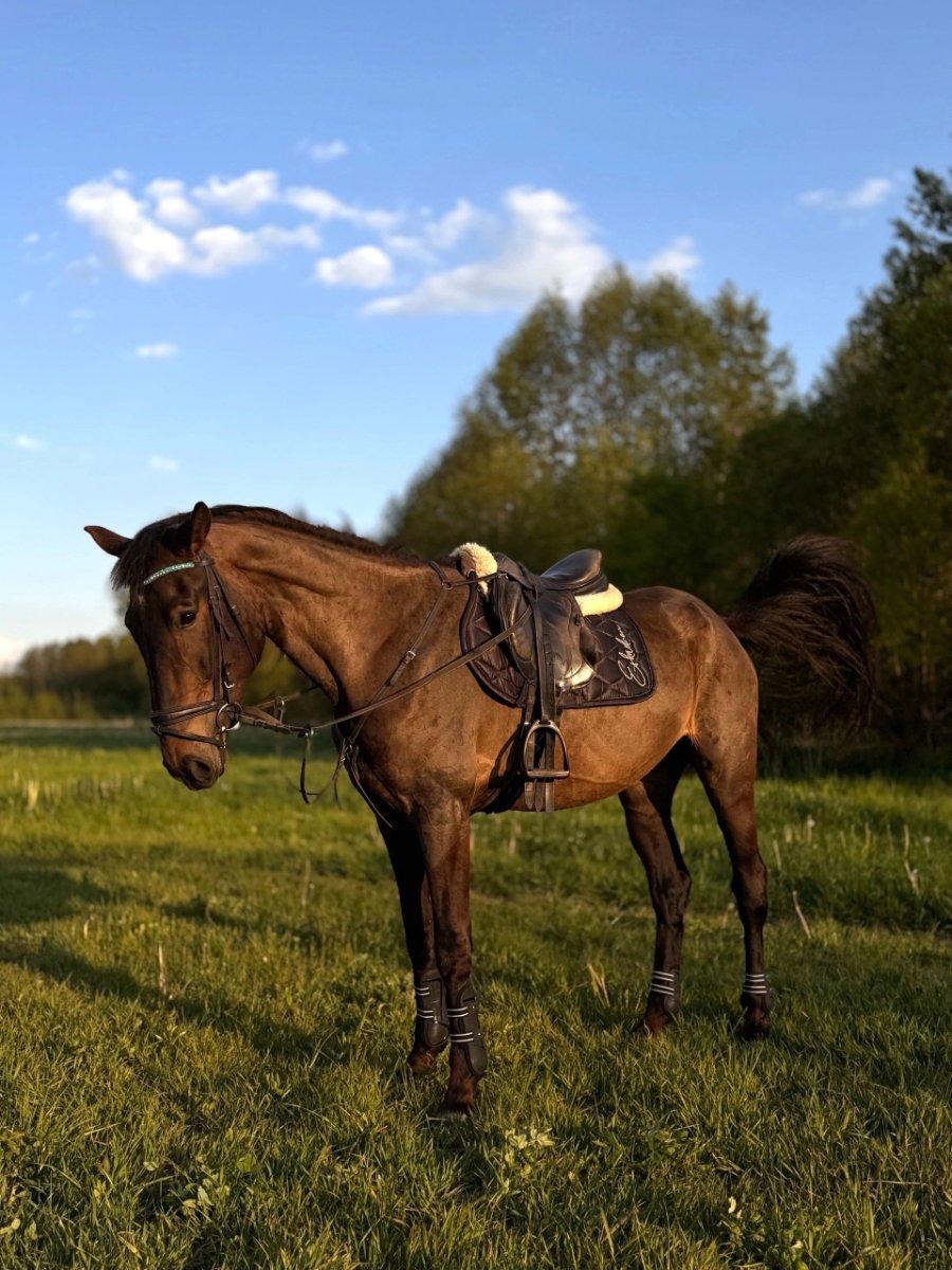 Имеет стартовый опыт по маршрутам до 90 см, дома напрыгана по гимнастике до 110 см. Очень приятные и мягкие аллюры. Безопасная, с крепкой психикой, аккуратна к детям.