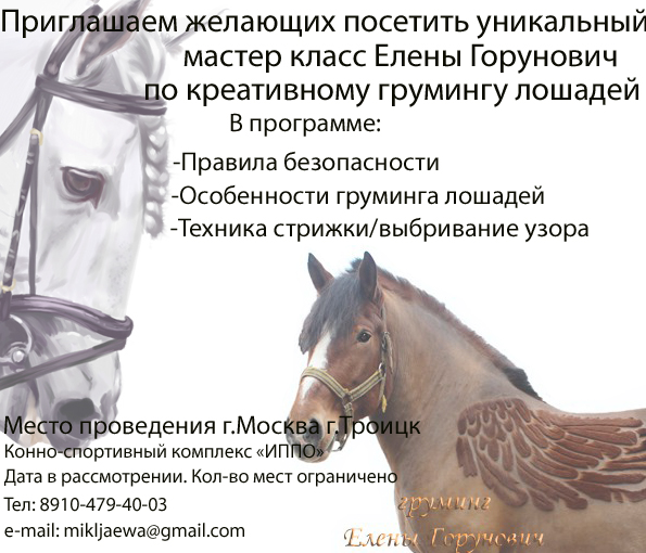 Приглашаем посетить уникальный Мастер-класс Елены Горунович по креативному грумингу лошадей. Вы узнаете все тонкости груминга лошади. Особенности поведения во время ухода за лошадью, техника безопасности. У вас будет возможность самому по пробовать свои силы! Все лошадки участвующие в МК очень миролюбивы и спокойны. Всем участникам будут выданы сертификаты.