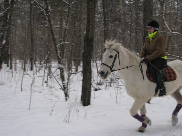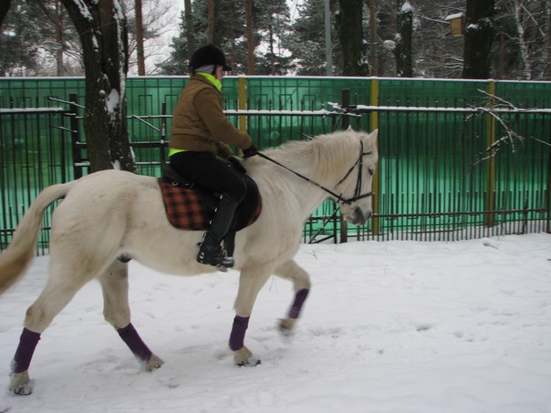 Прошло много времени. я еще занималась с Татьяной на разных лошадях. Мне посчастливилось проехаться на жеребой кобыле, поездить с главой управ в Подмосковье.. Из-за операции на копчике врачи запретили ездить на лошадях из-за угрозы нового воспаления. Так я и оставила конный спорт на долгое время. Однажды гуляя в любимом лесопарке Покровское-Стрешнево, при входе обнаружила рекламный щит, приглашающий всех желающих обучиться верховой езде. Так началась моя новая жизнь в седле. Там я познакомилась с замечательным тренером Ириной Георгиевной. Я записалась на занятие и в назначенный день я пришла в конюшню. Допросив меня с пристрастием, что я вообще умею и как давно сидела в седле, мне вывели рыжего, толстенького жеребца по кличке Алый. Он был самый мягкий, но упрямый конь. Надо было сразу показать кто главный и тогда он будет тебя слушаться все время. Так и началось мое занятие. Он мне напоминал Марьянку, только упитаннее и ленивее. Я впервые ездила в безопасных стременах. Как и ожидалось, умудрилась порвать резинку. В этой конюшне я прозанималась 4 занятия и после был небольшой перерыв. А после тренер сообщила, что переезжает в другую конюшню. Для меня было это неожиданностью. Ничего не поделаешь, но я в след за тренером перешла в конюшню на Петровско-Разумовской, в которой по сей день занимаюсь. Тут и природа, воздух, лес под боком! На первое занятие мне определили красивейшего орловца. моего ровесника. Конь средней комплекции серый в гречку. Тут были другие правила. На плац без шлема было запрещено выходить. Так что я впервые в жизни надела шлем и началось.. Первое занятие проходило на шагу, Витя вечно хотел в середину уйти. Но к середине тренировке мы договорились и после получения хлыстика (без него я не могла выслать коня в рысь) мы начали рысить. Было прикольно, конь мягкий и очень удобный. После тренировки под чутким присмотром я расседлала коня и счастливая завела его в денник. Накормив морковкой и всех лошадей в конюшне ибо накупила очень много моркови и порезав ее хватило всем по приличной порции. Так я занималась с переменным успехом по воскресеньям только на Вите. Я в него влюбилась и это наверное на долго. Вчера же меня тренер пересадила на замечательного коня по кличке Калипсо. Конь высоченный, я на него вскарабкивалась, как на Эверест! Как потом рассказала тренер, конь выездковый и управляется на пальцах. Но судя по опыту он не только а пальцах, но и силой мысли управляется. Час тренировки прошел очень продуктивно. Под конец тренировки стало темно, но тренер не делала поблажек и под конец мы с Калипсо стали получать долгожданную похвалу. Впервые в жизни посадка была идеальной. На рыси ноги не улетали вперед пока я не начинала сбиваться и приходилось начинать все с начала. Под конец занятия я осталась одна на плацу и сама регулировала свою тренировку. Немного пошагав мы рысили и так до команды отшагивать и идти домой. Расседлав коня и отправив в денник. я получила свой уголок в раздевалке и побежала домой. Дорога скажу я вам очень стремная! под мостом и после вдоль жд путей. естественно в ночное время очень много иностранцев. Добежав до метро, решила ехать в тепле. а не на автобусе. Так и прошла моя последняя тренировка. Продолжение следует. Надеюсь и с фото.