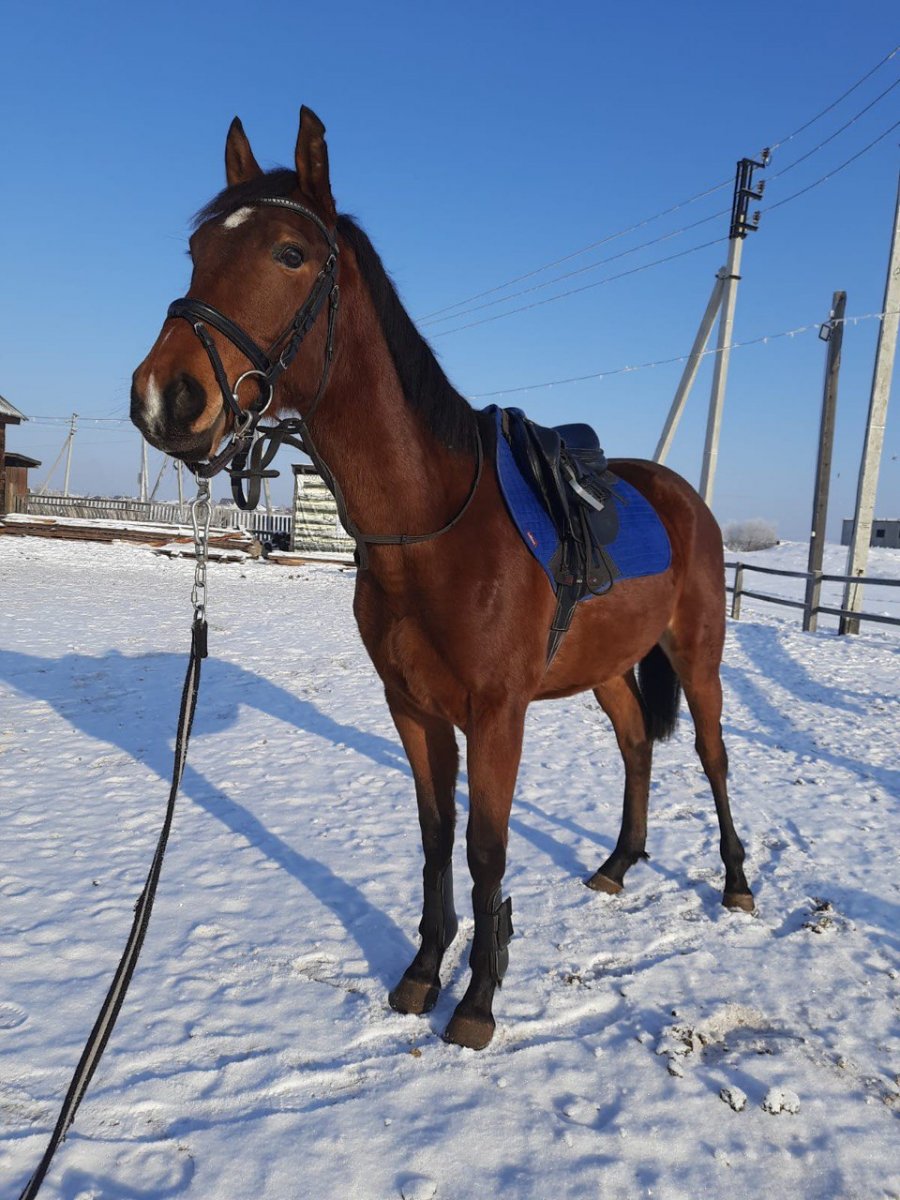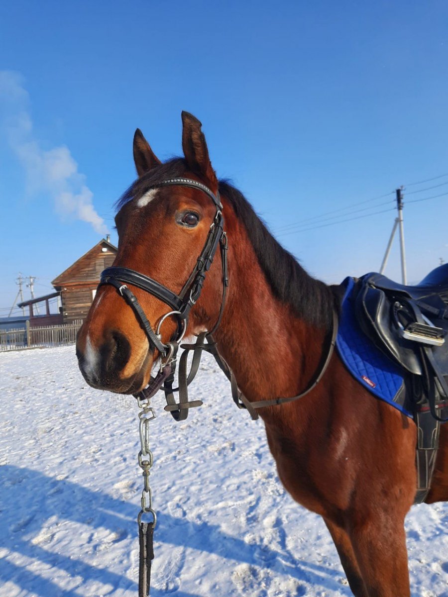 Проходит тренинг молодой спортивной лошади: работает на корде, плавно проходит первоначальную заездку (шагает и рысит под седлом). Прогулки в компании и один по пересеченной местности.