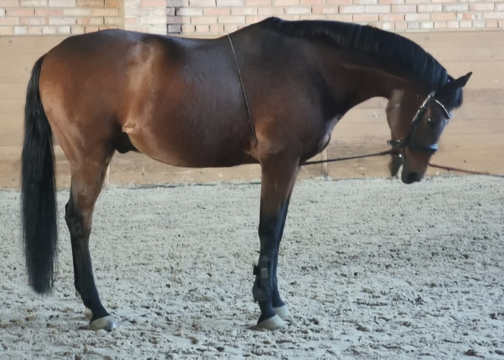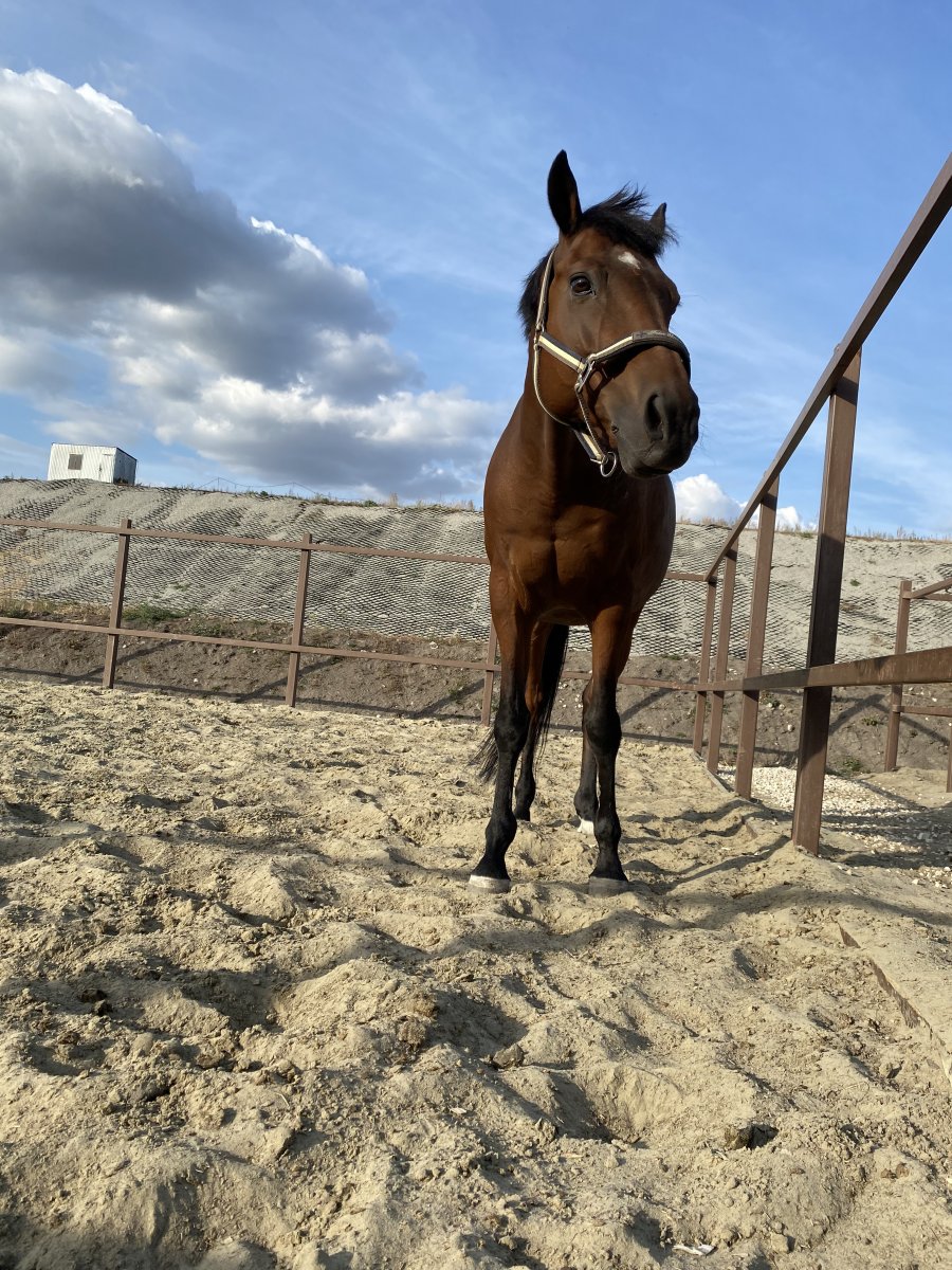 Работает в выездке(манежная езда,кавалетти)Ходит жерди на рыси и галопе.