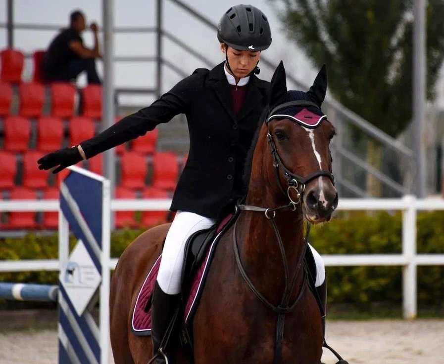 Старты - маршруты до 110 см, регулярно в призах. Дома - маршруты до 120 см, одиночные до 140 см. Уверенно идет на барьер, не обносит. Ласковый, безопасный. Станет хорошим учителем. Гуляет весь световой день, стабунен.