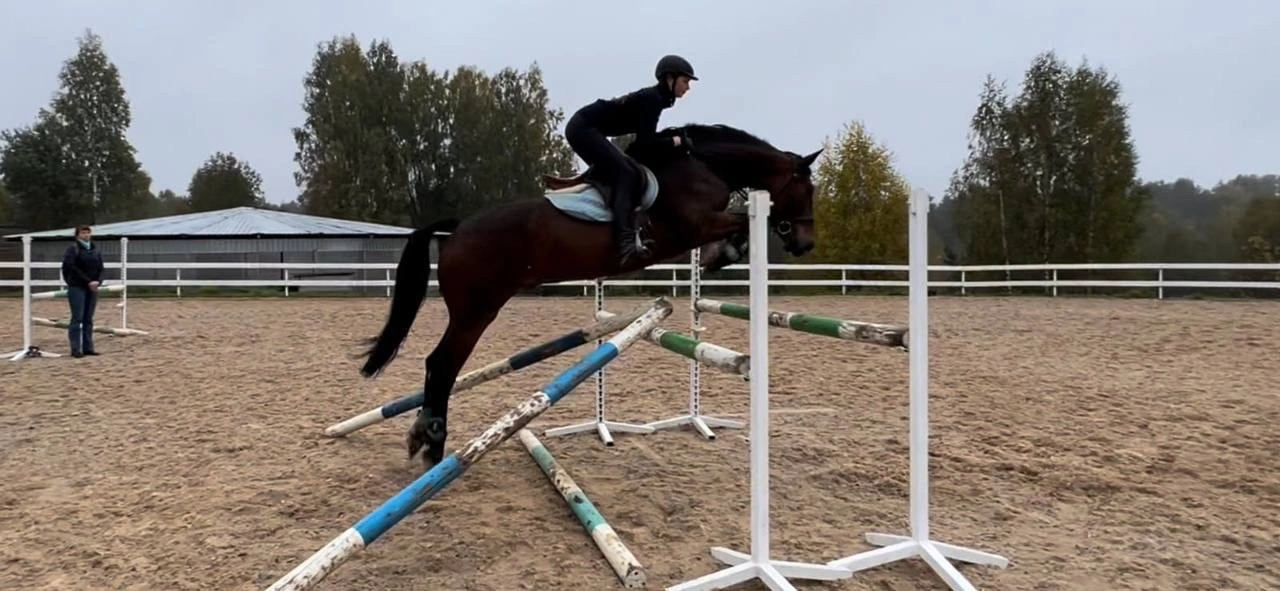 Подойдет под детей и начинающих. Отличный учитель. Ничего не боится, прыгает маршруты до метра, в гимнастике выше. Хорошо выезжен. Знает троеборные барьеры.