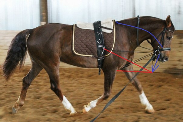 Тут дело в другом. Если внимательно посмотреть на серенького, видно, что он выходит в контакт с веревками добровольно (это видно по расслабленной спине и, особенно, по расслаблению приставки). И опять же веревки пристегнуты намного свободнее, чтобы дать коню возможность самому найти необходимый контакт. В то время, как Гаврику придано такое положение насильно. Поэтому вместо расслабления и проработки мышц он тратит всю энергию на сопротивление этим веревкам.