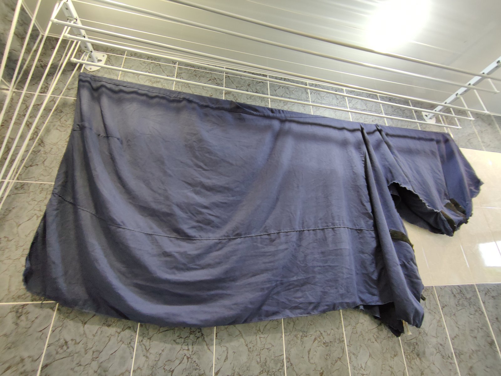 6. Сушильная попона декатлон. Размер М (был хорошо на 135). Отличное полотенце после мойки или "потной работы". С капором. Не рваная. Заменено колечко на груди (для крепления нагрудного ремешка). 1500 руб.